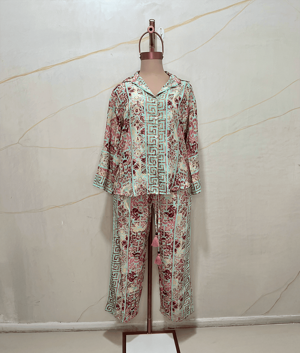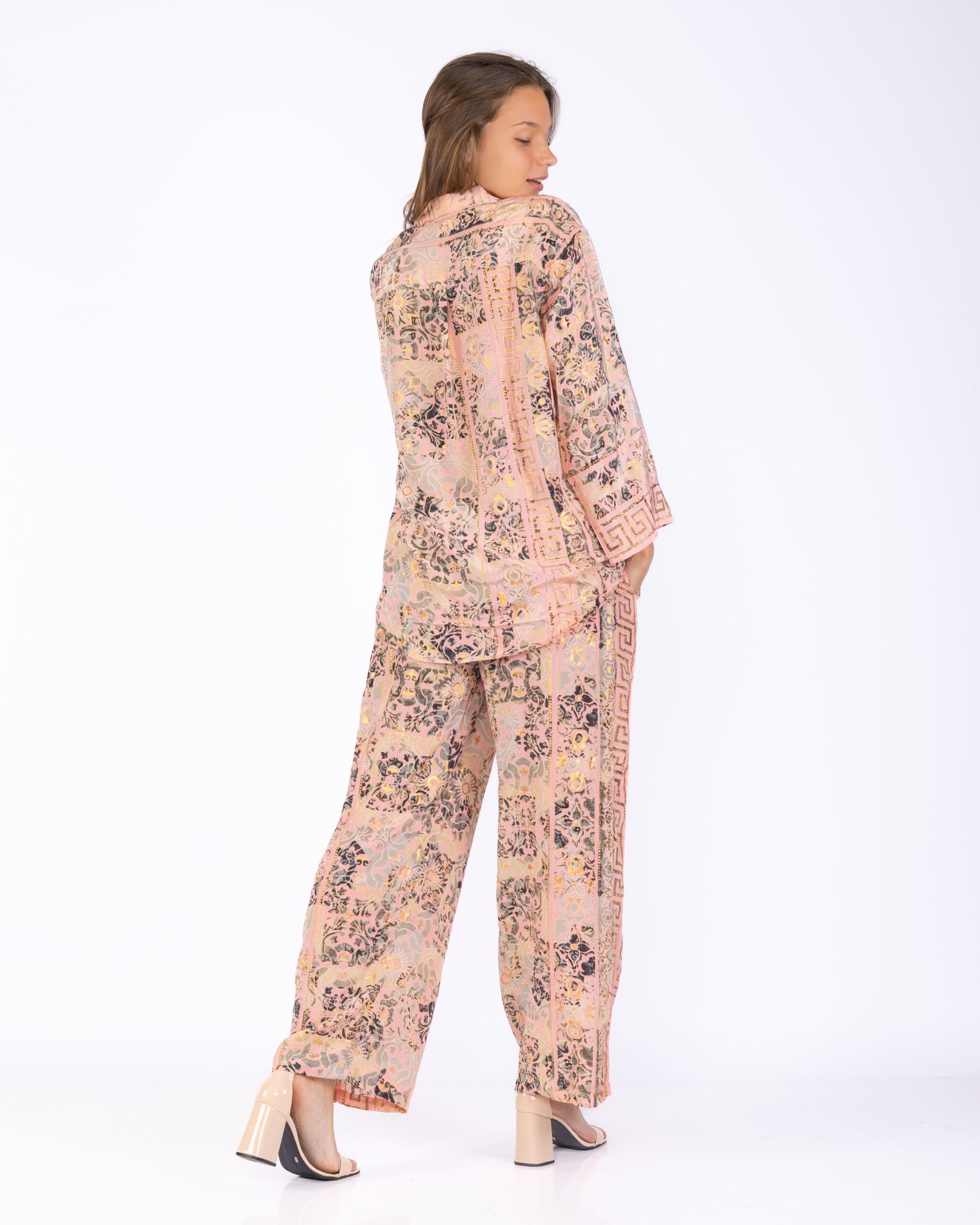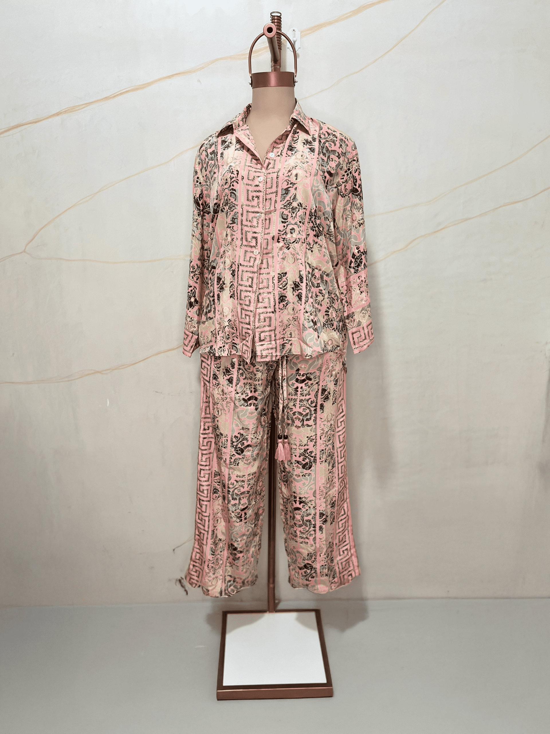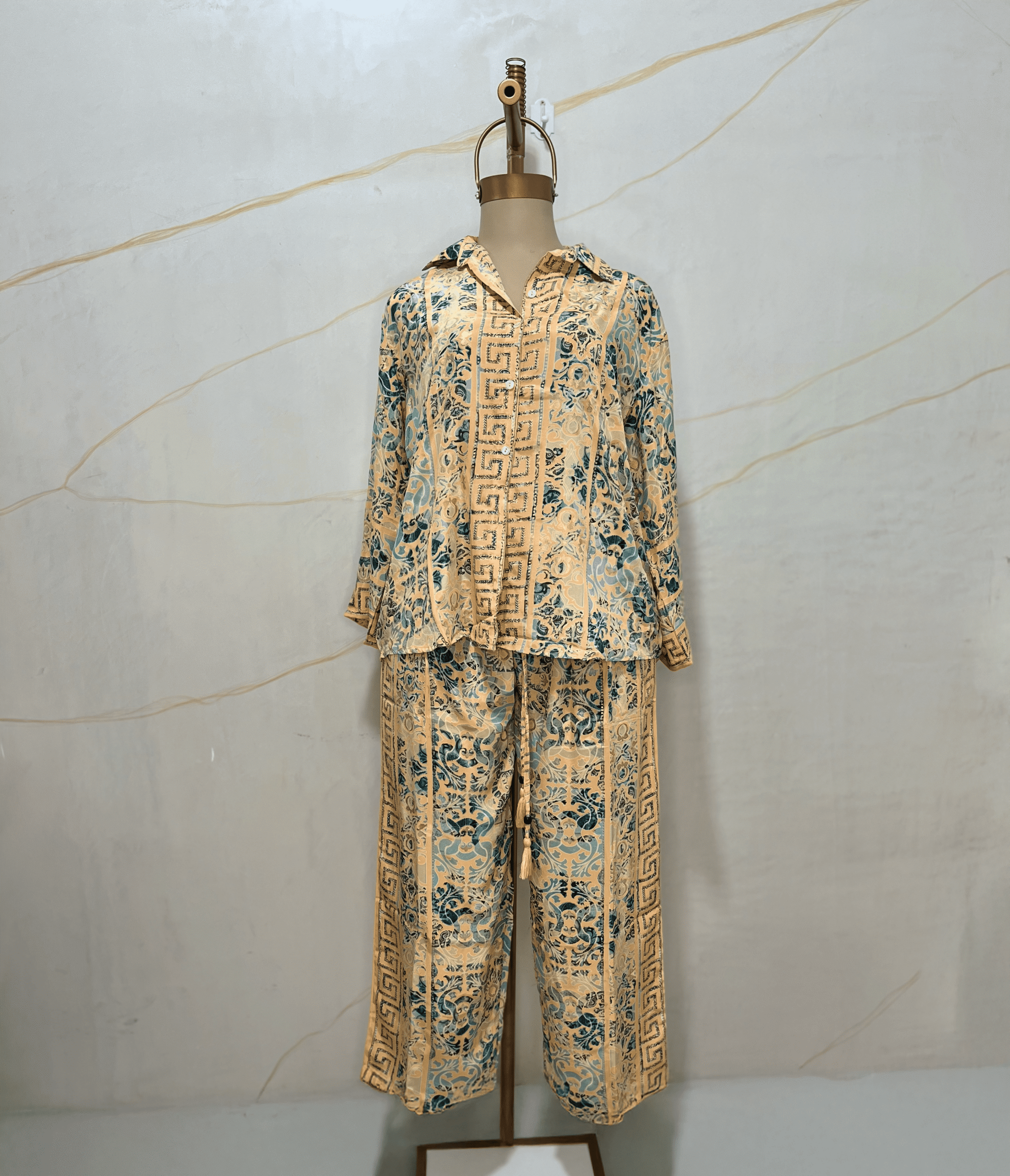 Conjunto de seda artificial , con camisa manga larga y un pantalón con corte recto