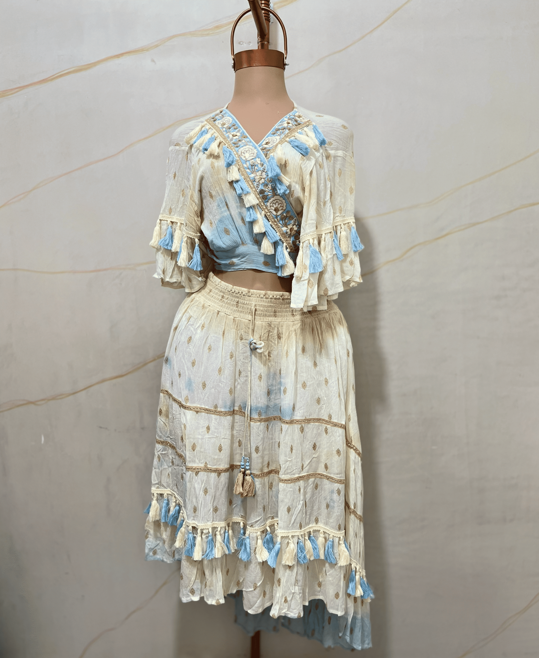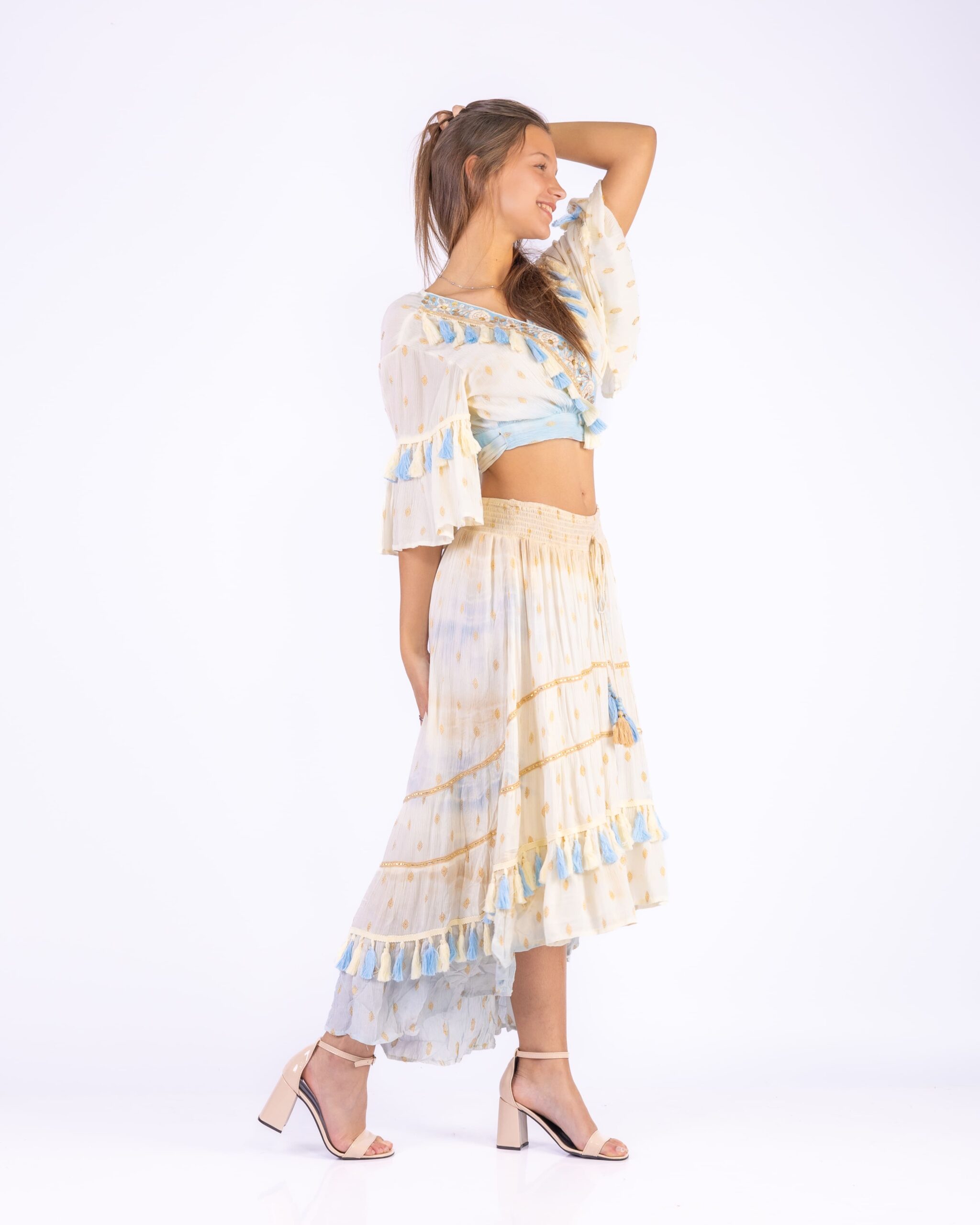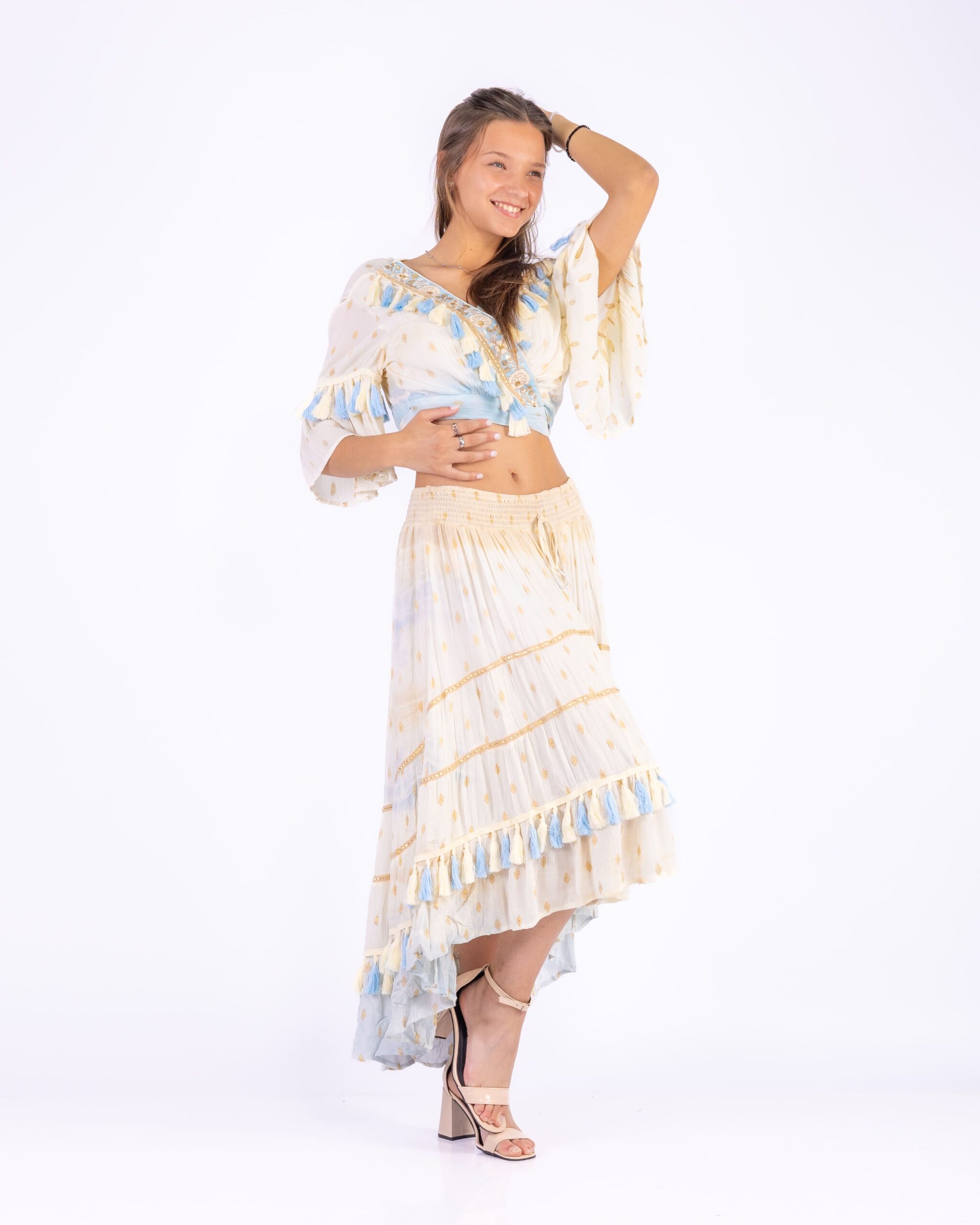 Conjunto de bambula, diseño batik .Falda con un corte asimétrico y en su ruedo se encuentran borlas ,la parte del top en su escote encontramos apliques bordados y borlas en sus mangas