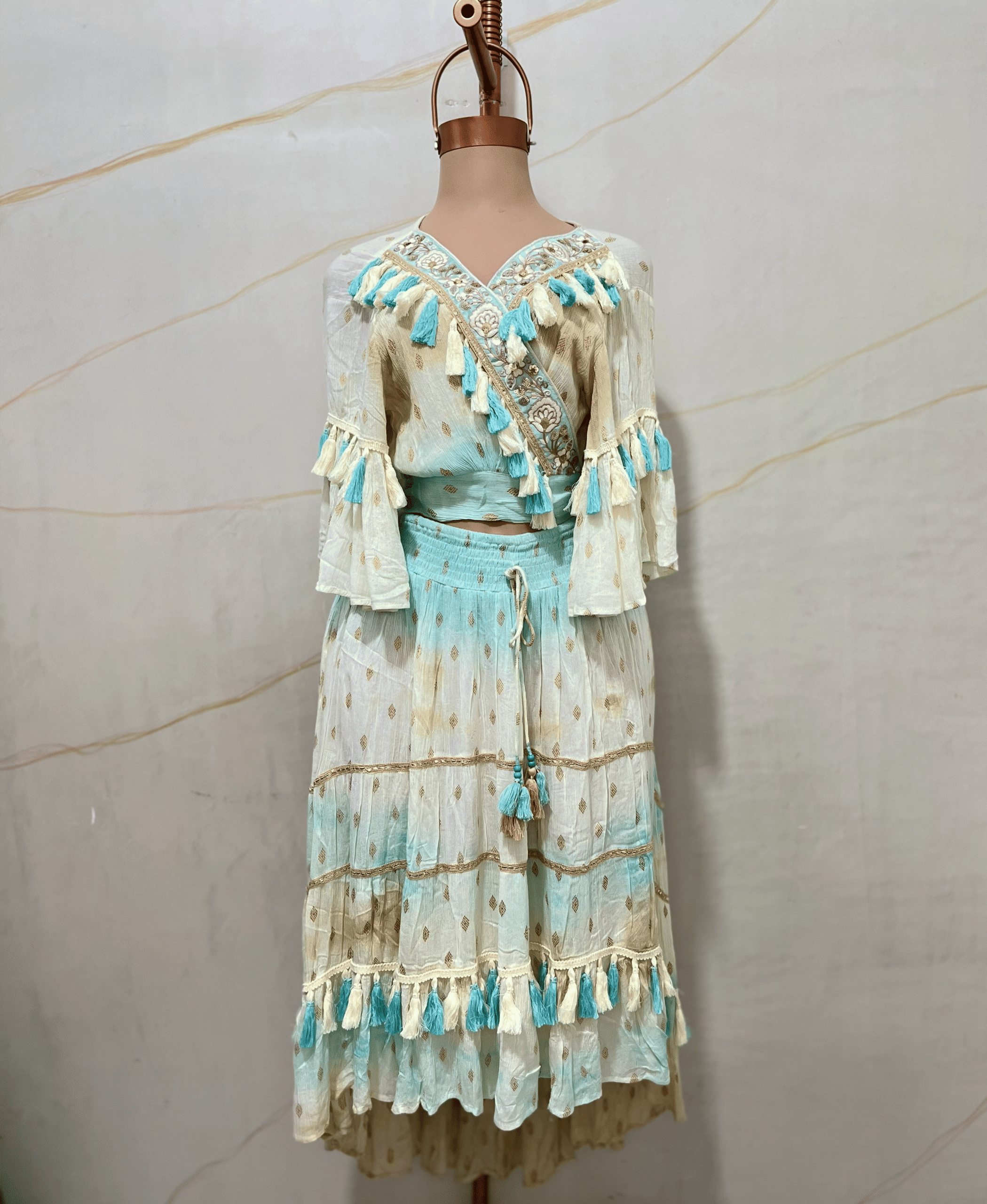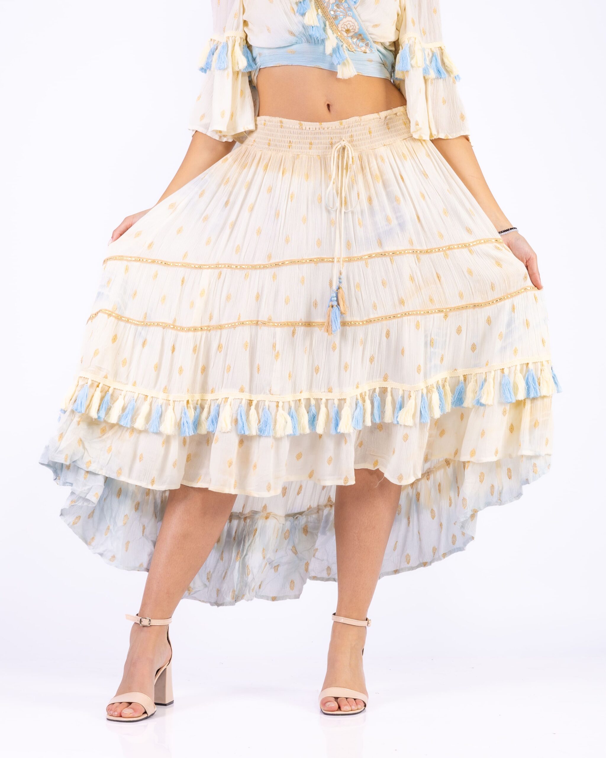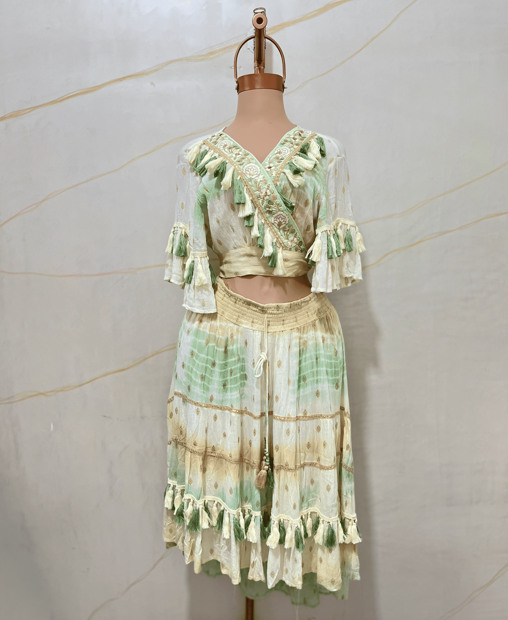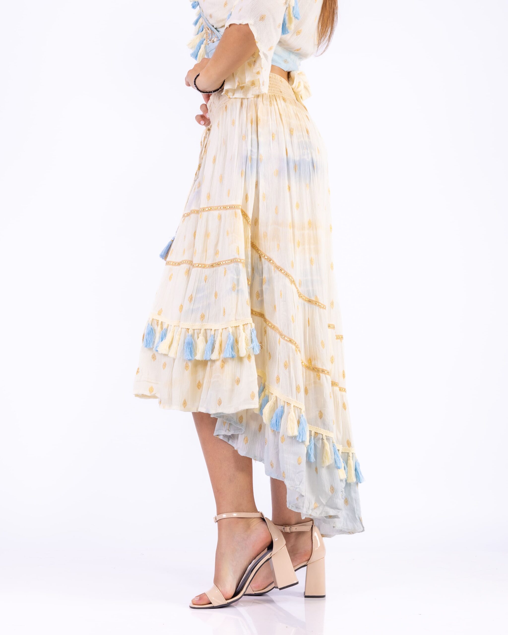 Conjunto de bambula, diseño batik .Falda con un corte asimétrico y en su ruedo se encuentran borlas ,la parte del top en su escote encontramos apliques bordados y borlas en sus mangas