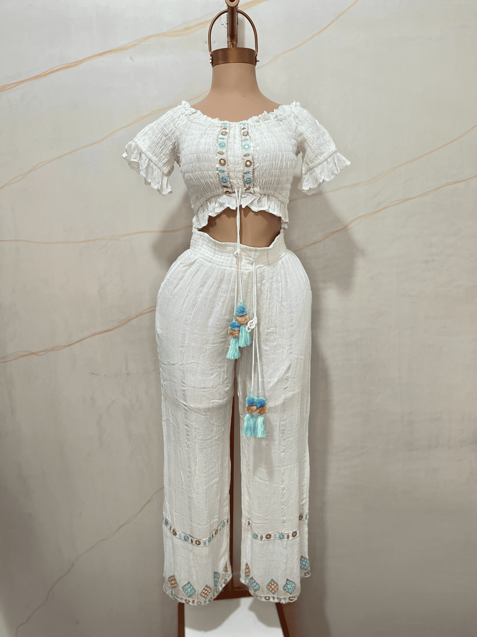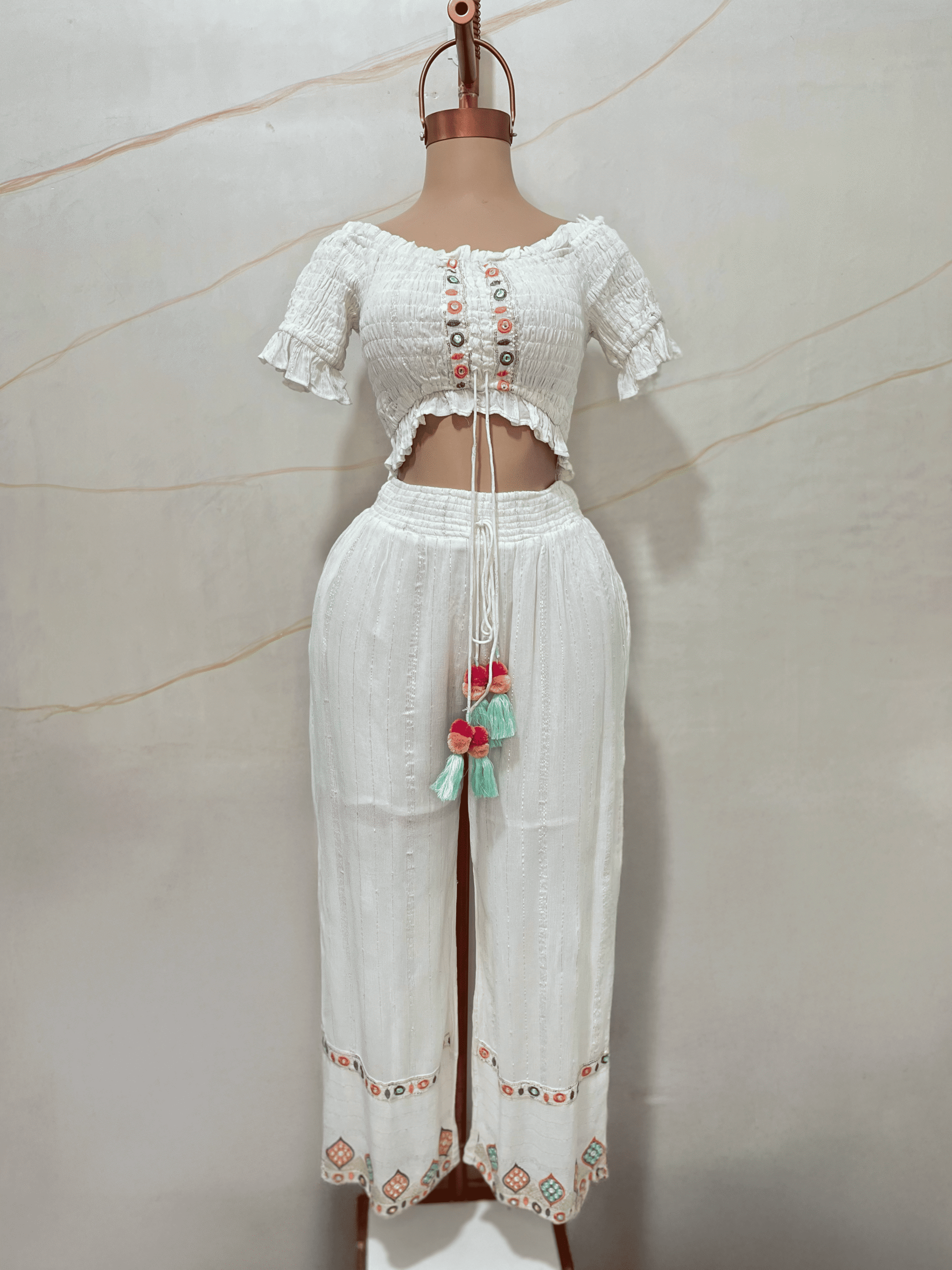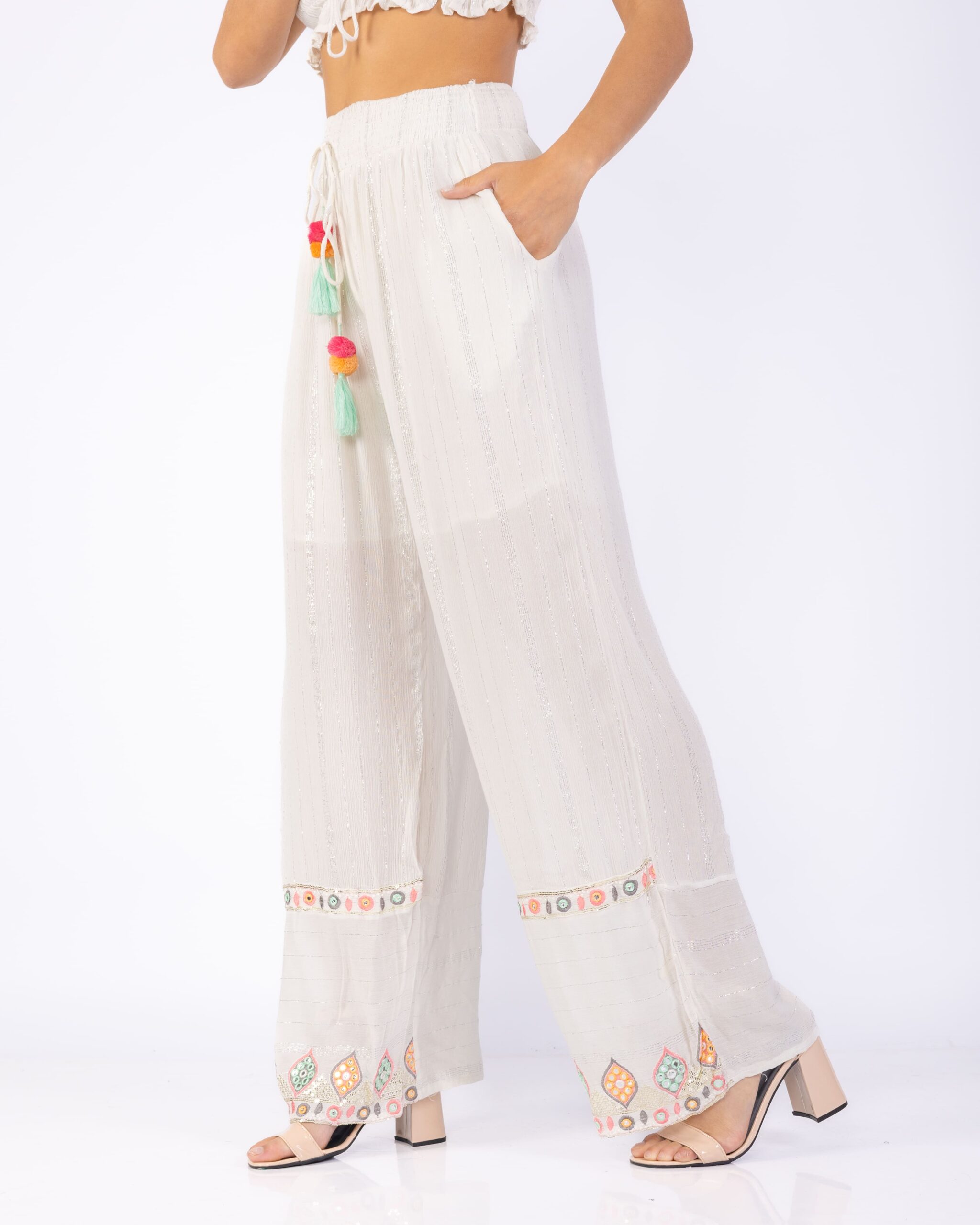 El pantalón es de tiro medio con cintura elastizada y cordón regulable con borlas y pompones combinados. Su silueta es amplia y fluida, con bordados geométricos multicolor en el ruedo y pequeñas aplicaciones en hilo en toda la prenda.