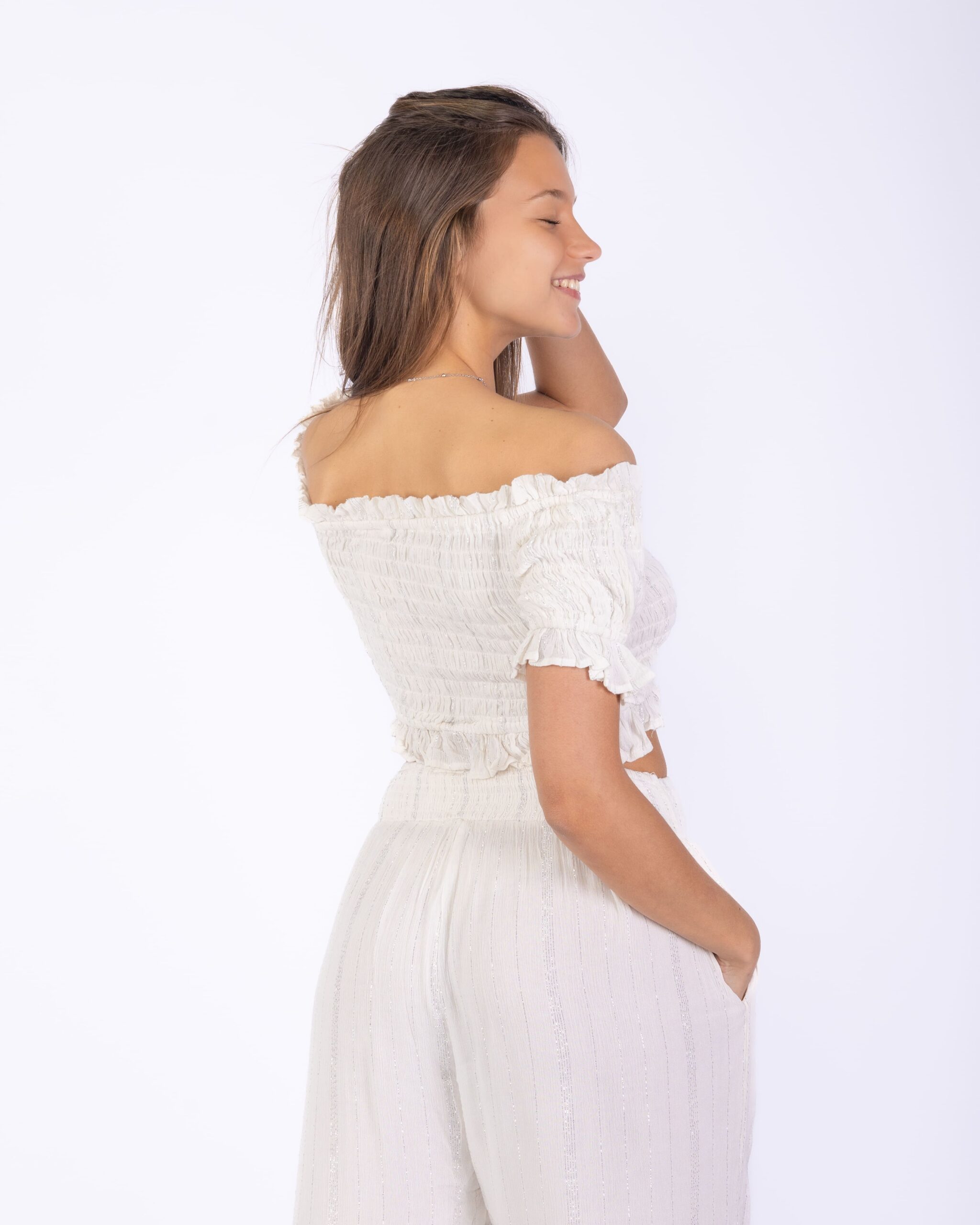 Conjunto de dos piezas confeccionado en tejido liviano con textura tipo bordado suizo. El top es corto, con escote estilo bardot (hombros descubiertos) y elástico fruncido en todo su contorno, lo que permite un calce ajustado y cómodo. Presenta una hilera decorativa de botones bordados al frente y un lazo con terminaciones en pompones de colores.