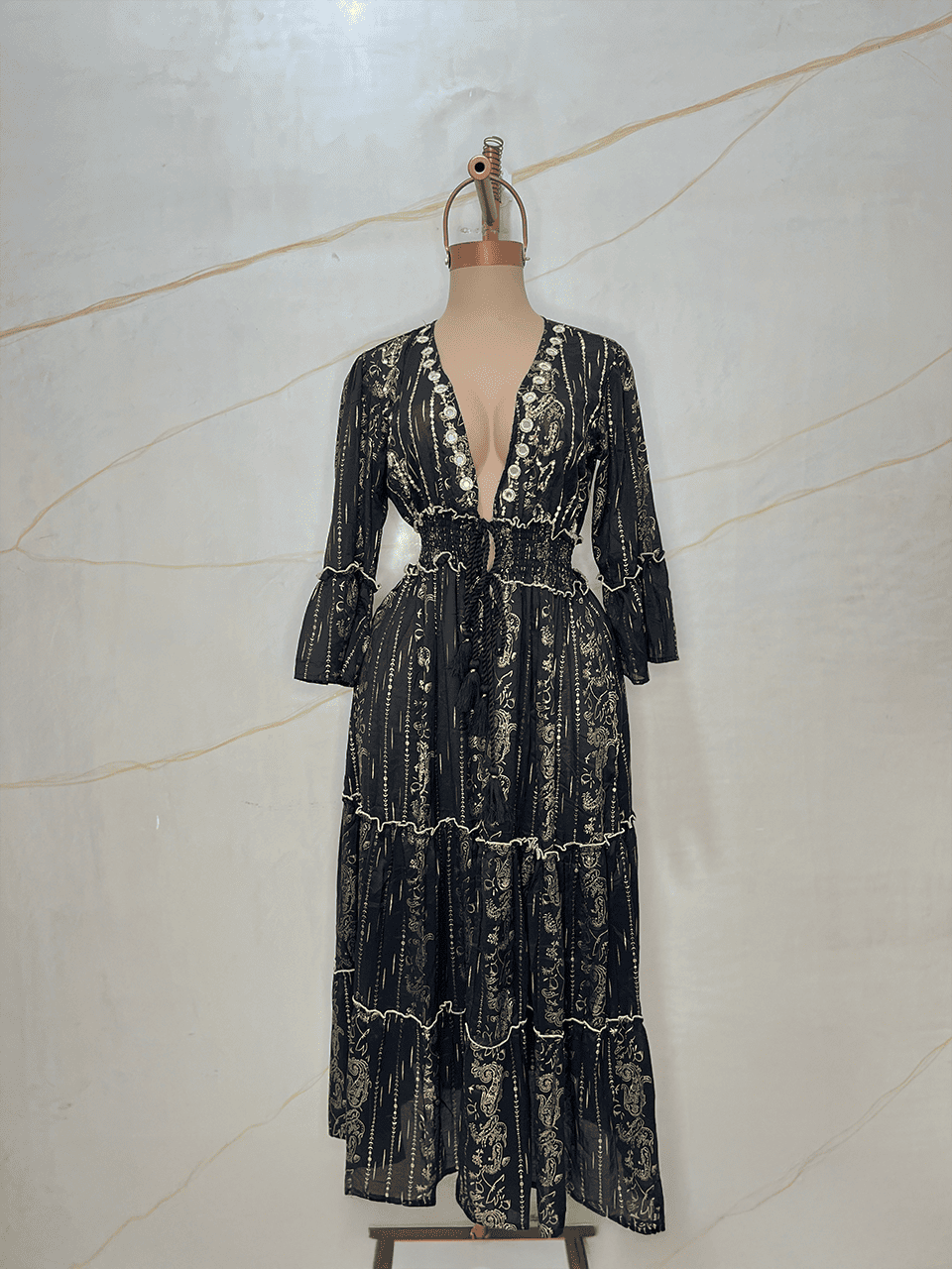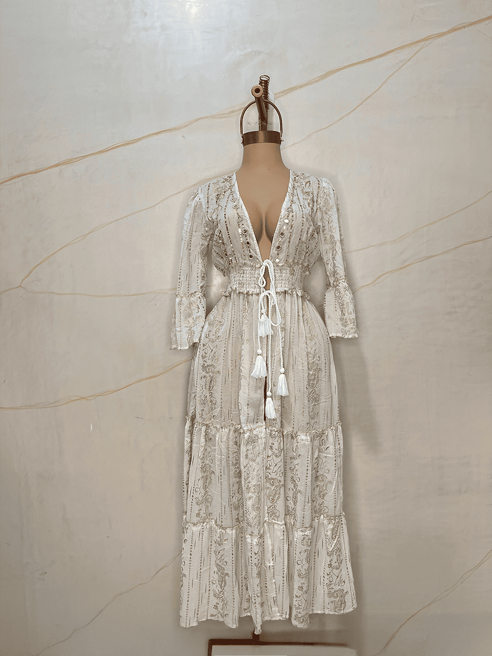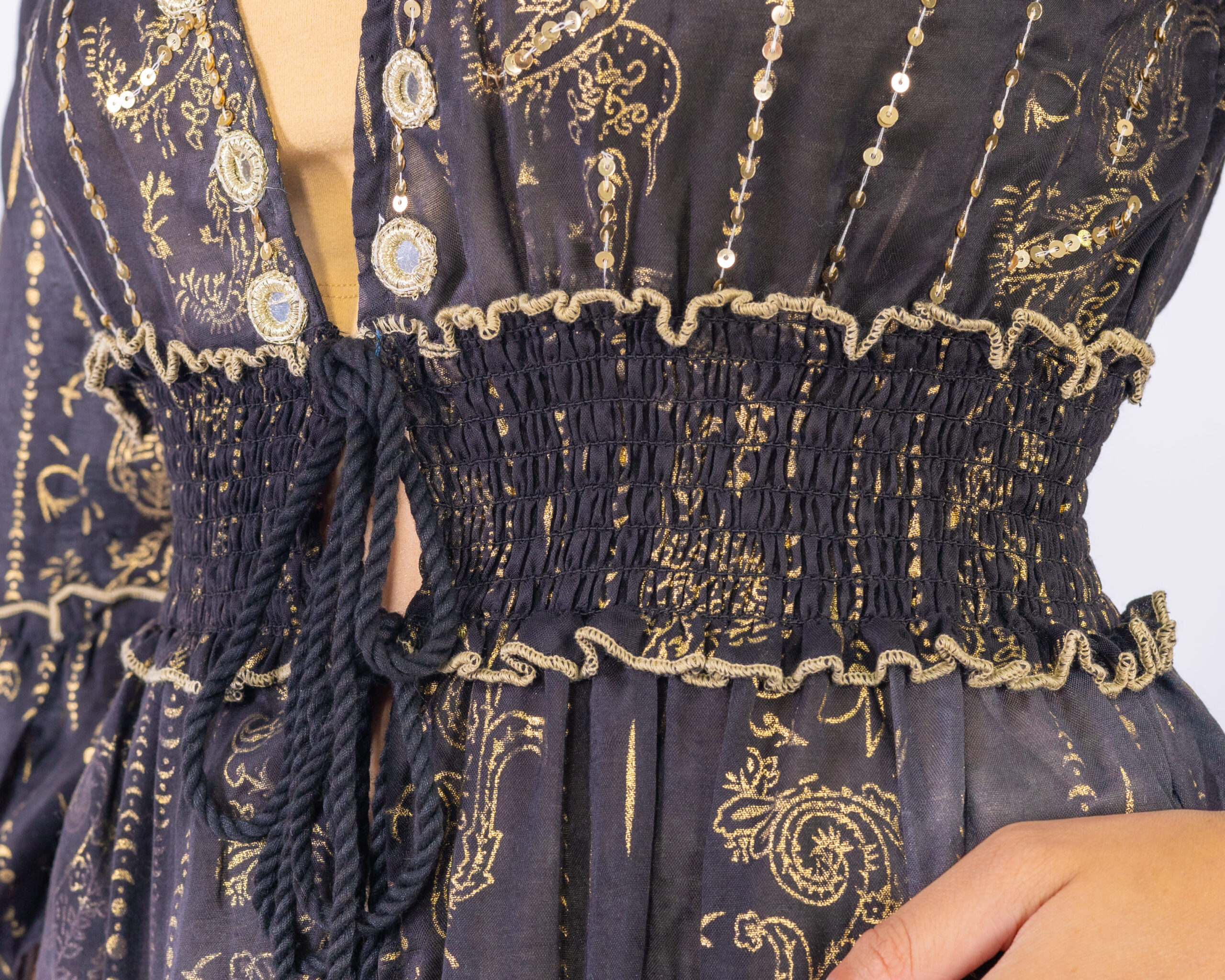 Presenta un escote en V profundo decorado con aplicaciones bordadas y lentejuelas, que realzan la prenda con detalles luminosos. La cintura elastizada con frunces se ajusta al cuerpo y se complementa con un cordón con borlas en los extremos.