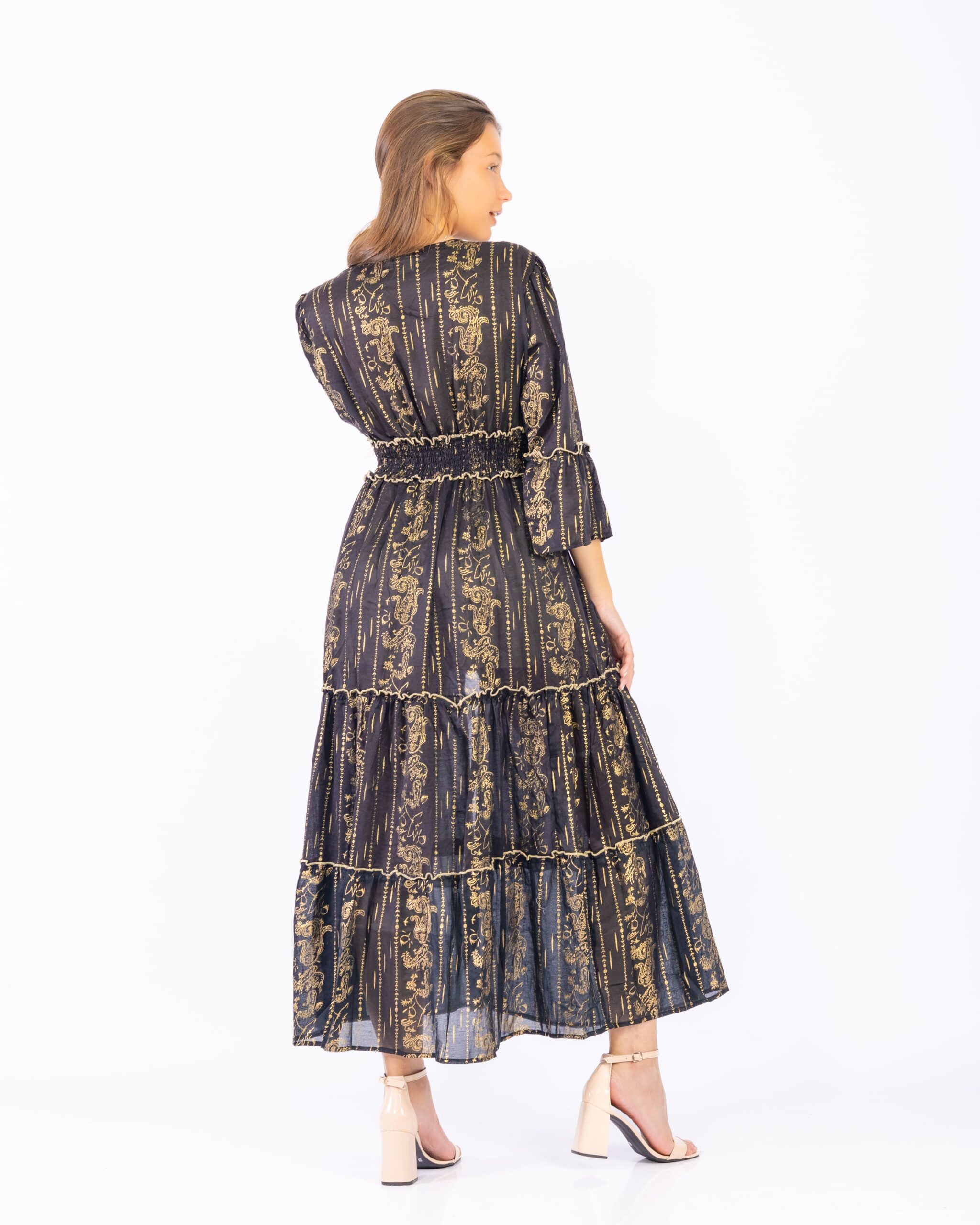 Las mangas tres cuartos con leve vuelo en el puño suman movimiento y frescura, mientras que la falda larga con tres recortes fruncidos ofrece una silueta amplia y fluida
