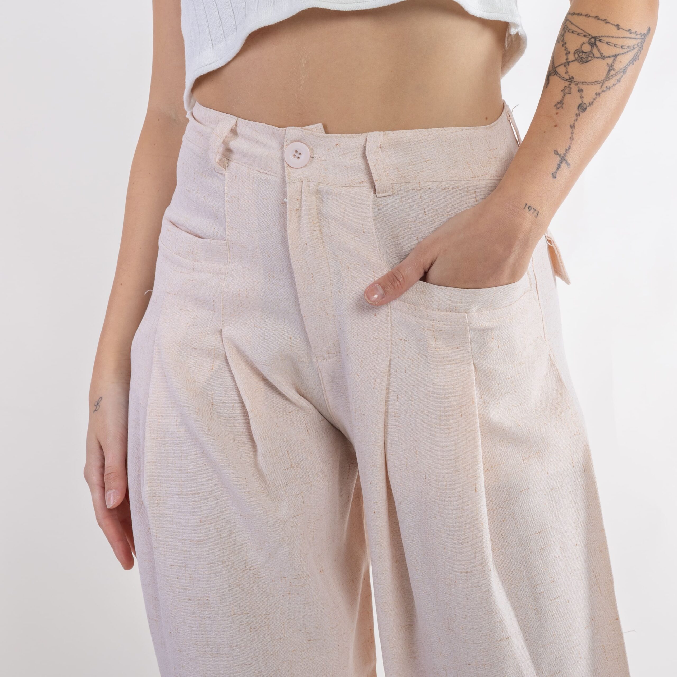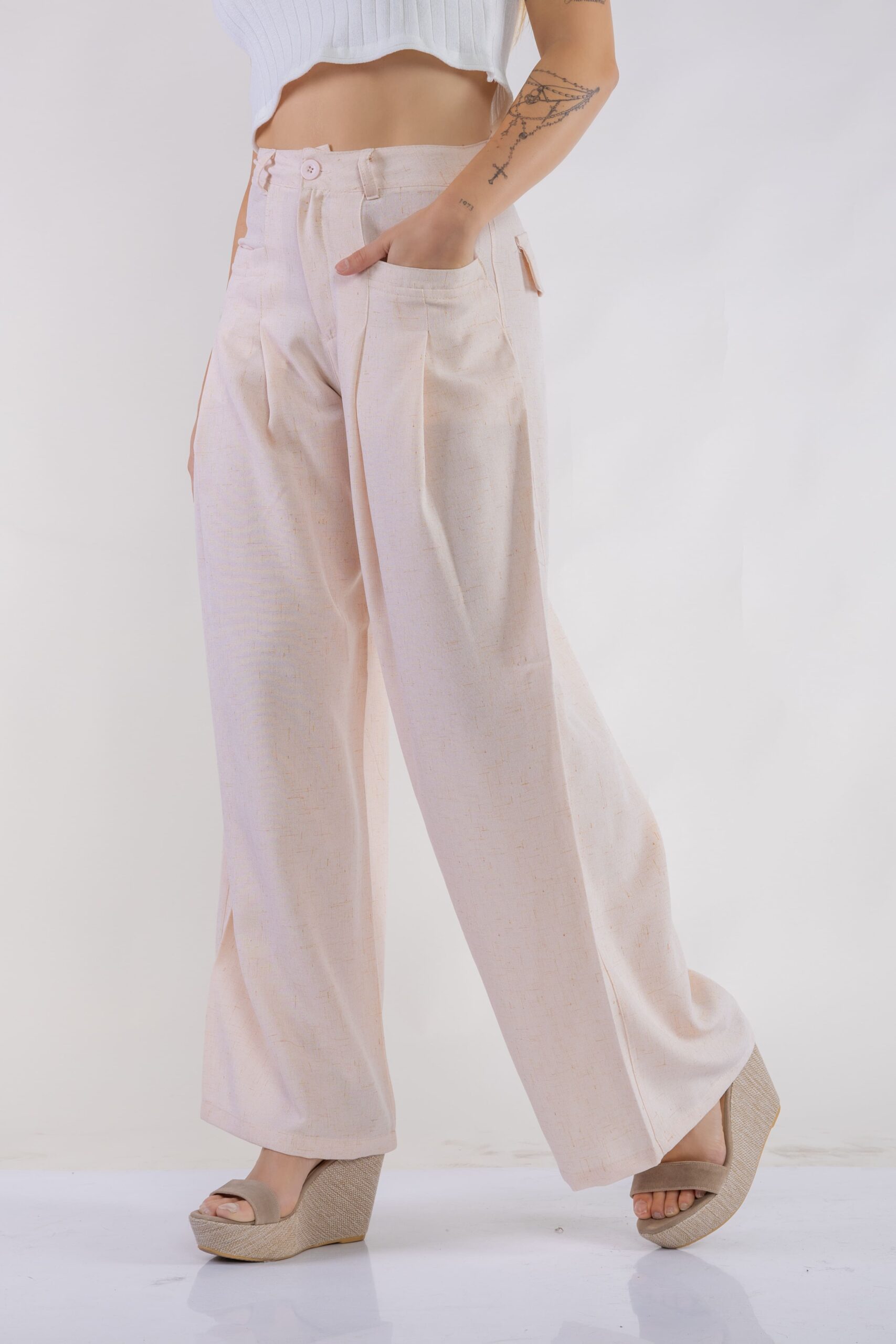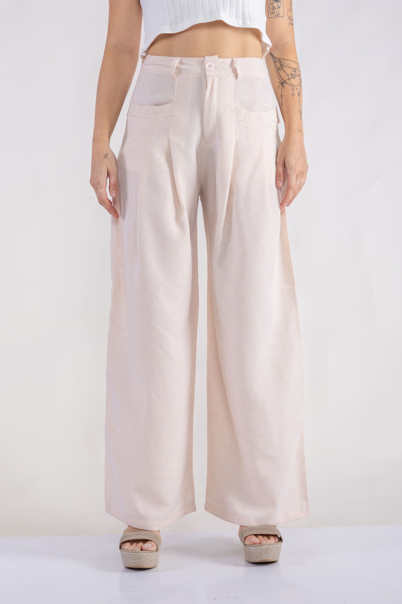 Pantalón de lino. Con bolsillos en delantero tipo ribete y tableado en recorte de bolsillo. De corte amplio, palazzo.