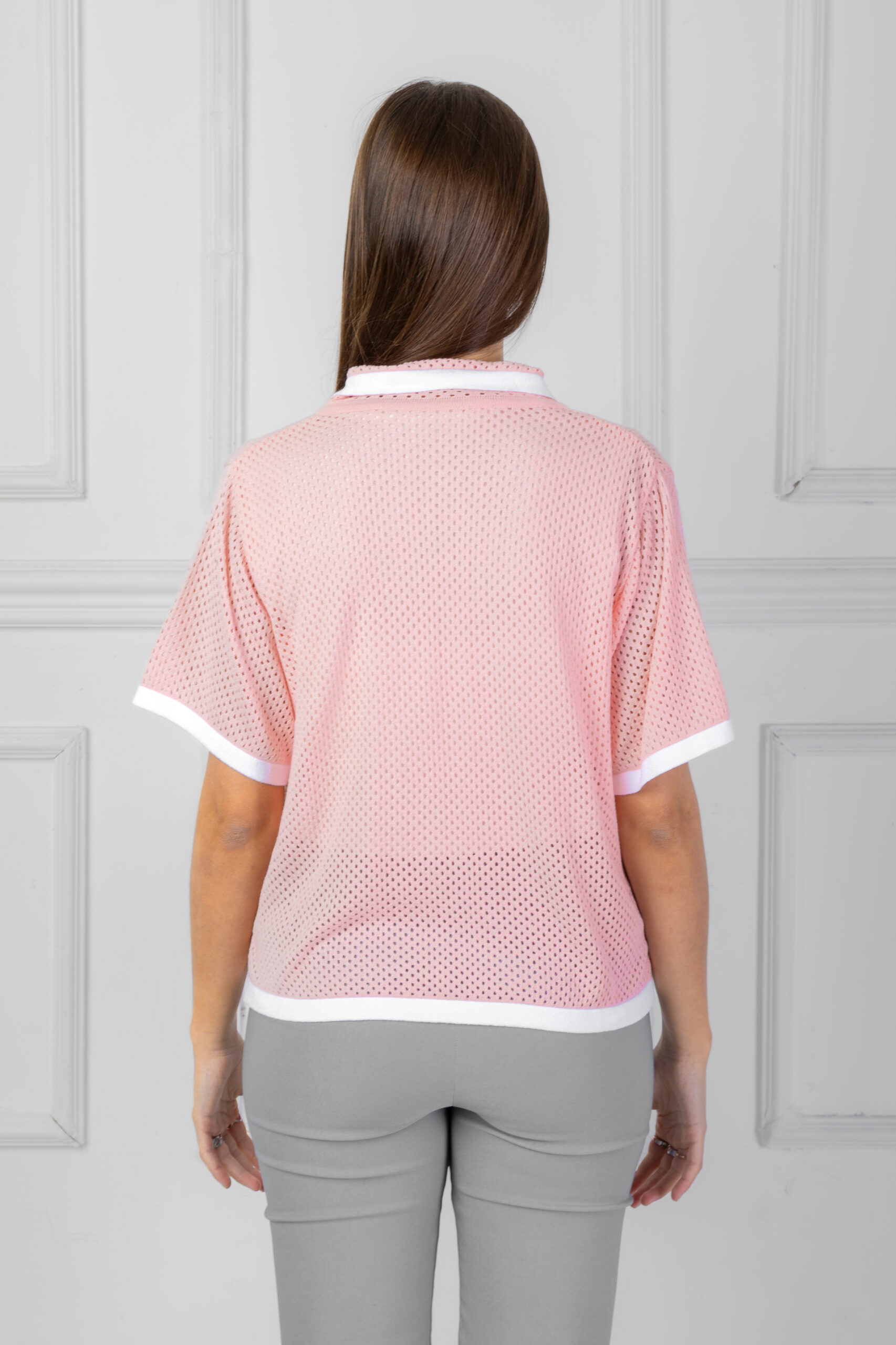 Camisa de lycra. Calada tipo chomba, para atar, con manga corta y bolsillito en el pecho. A contratono en ruedo, borde de mangas, cuello y borde de bolsillo