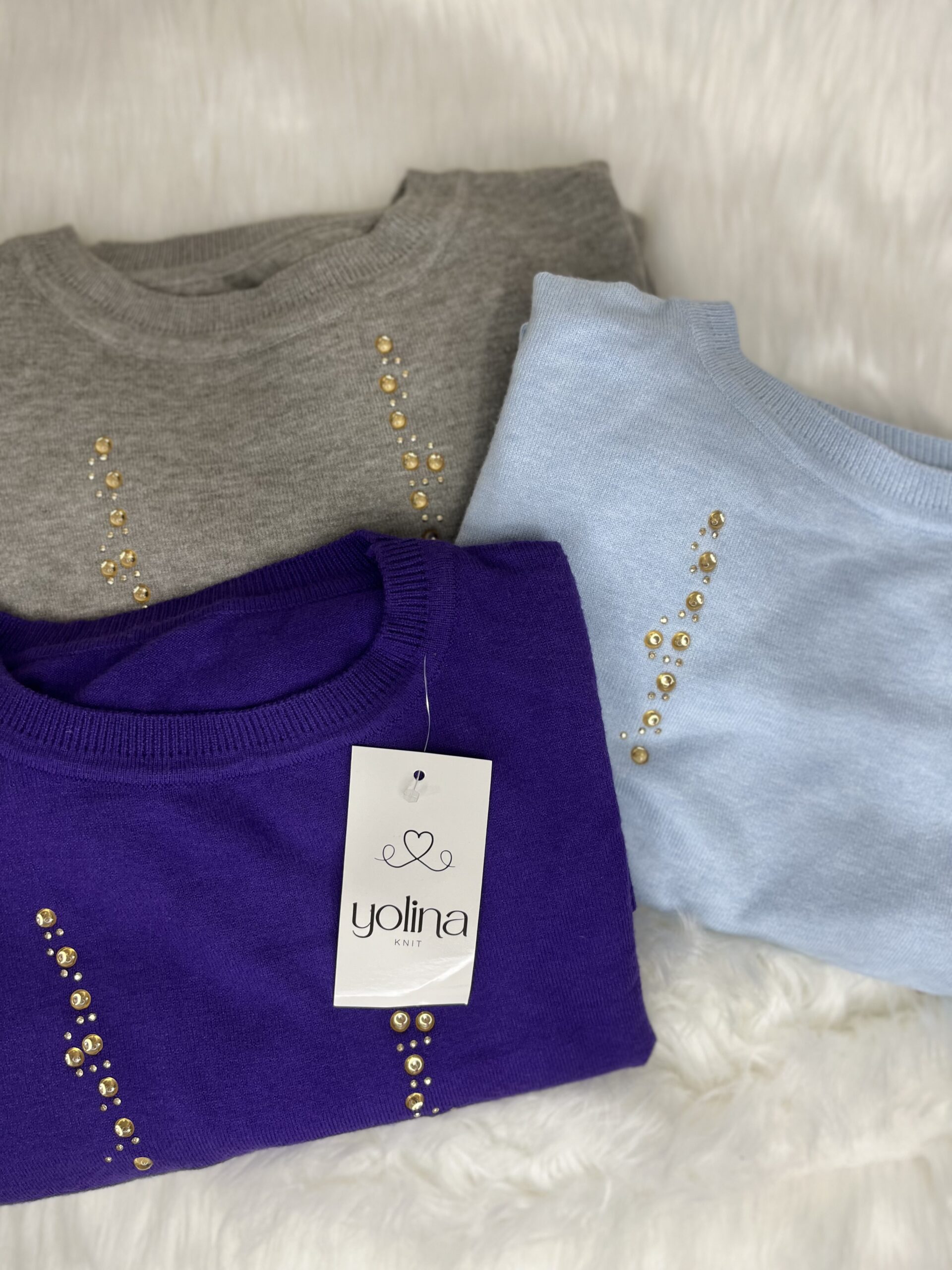 Sweter de bremer. Con detalle tipo morley en puños y ruedo, brillos a lo largo de su pecho y puños
