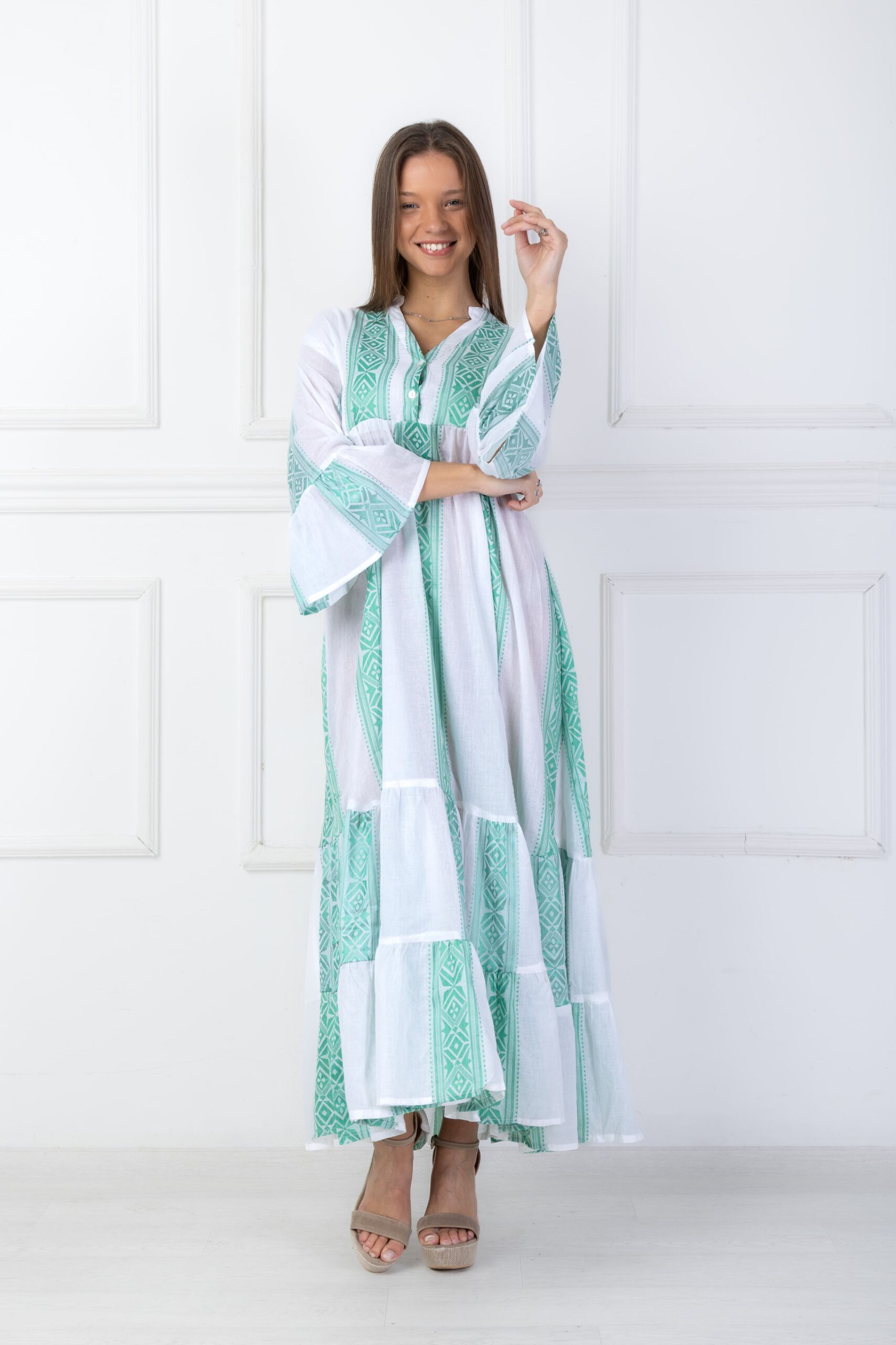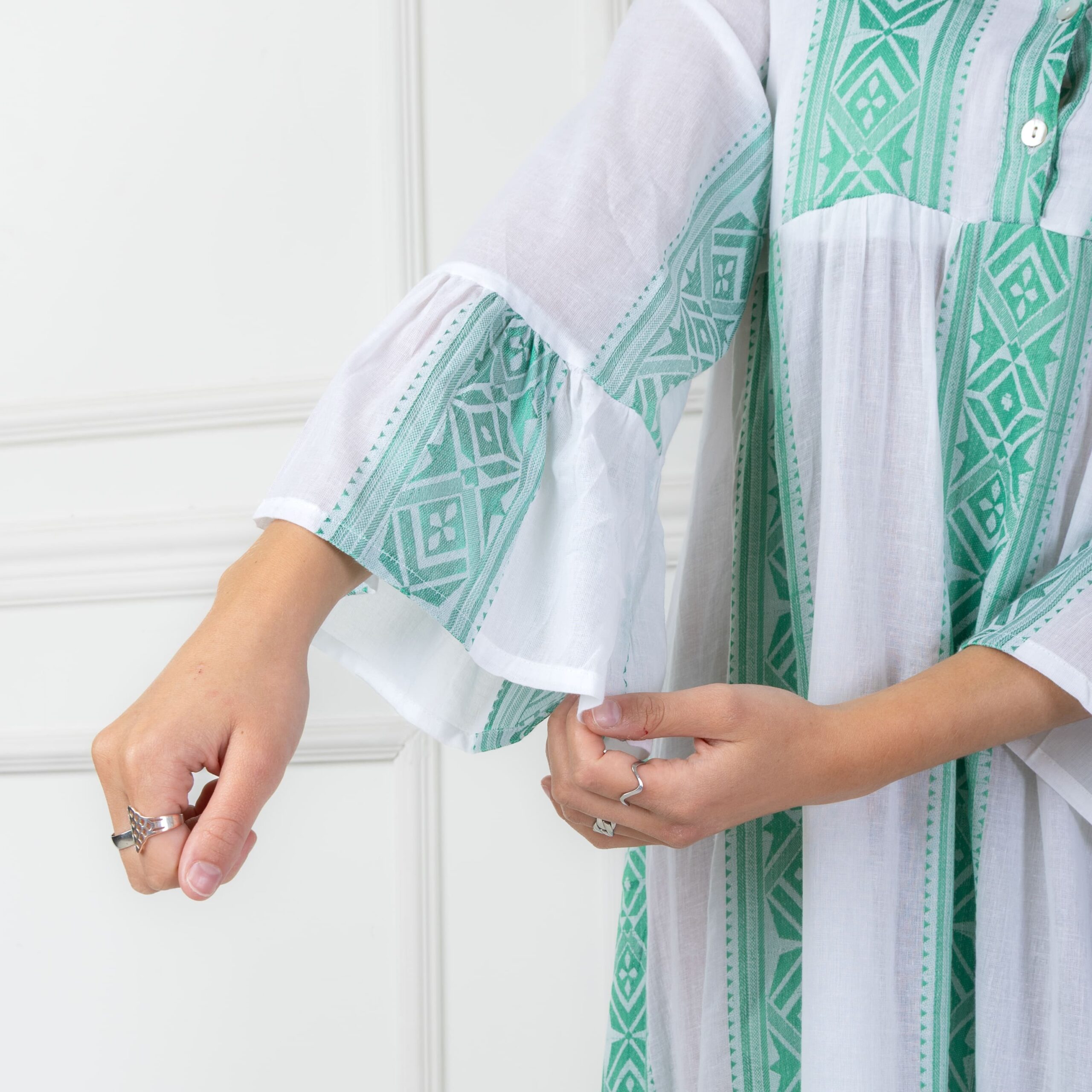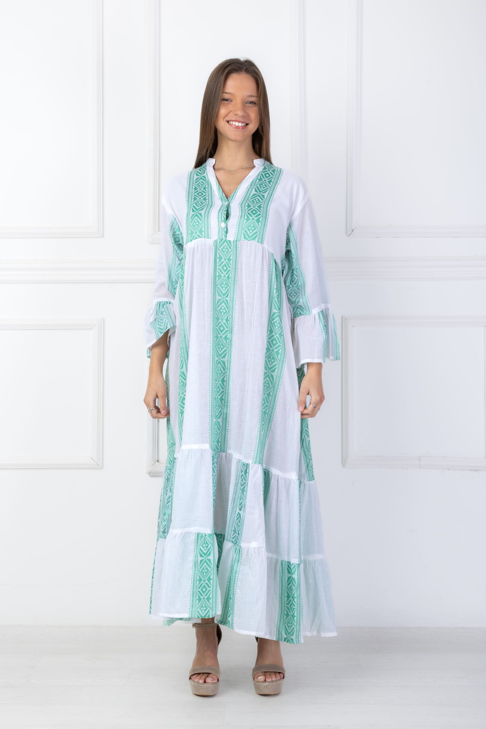 Túnica de largo maxi, con elástico en espalda para ajustar al cuerpo con vuelos en ruedo y puños. Cuenta con un escote en V. De algodón hecho en la India.