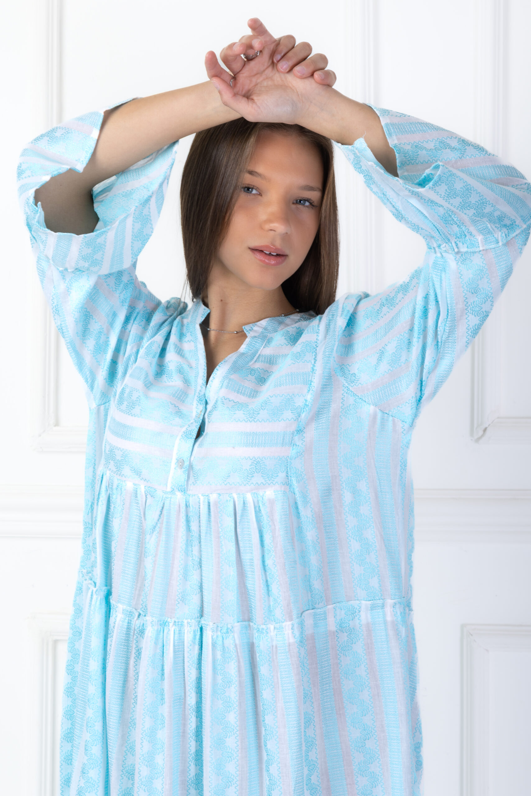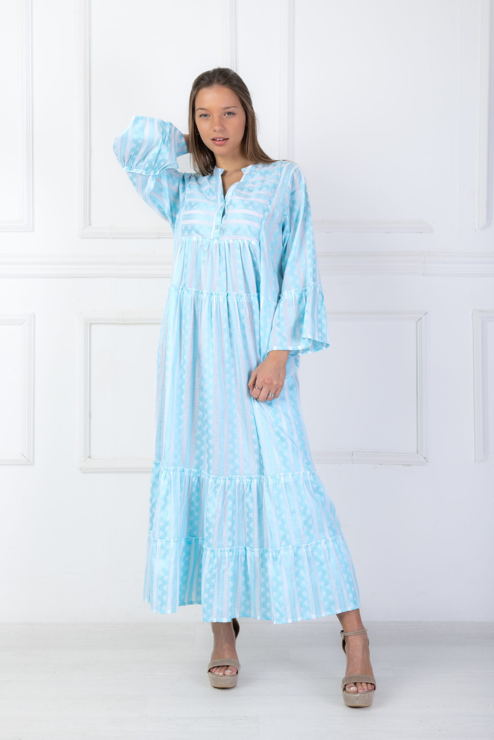 Túnica acampanada en capas con escote en V, cuello mao y cartera de botones. Tiene un hilado de color con lurex que forma los gráficos tipo estampa tribal. De algodón hecho en la India.