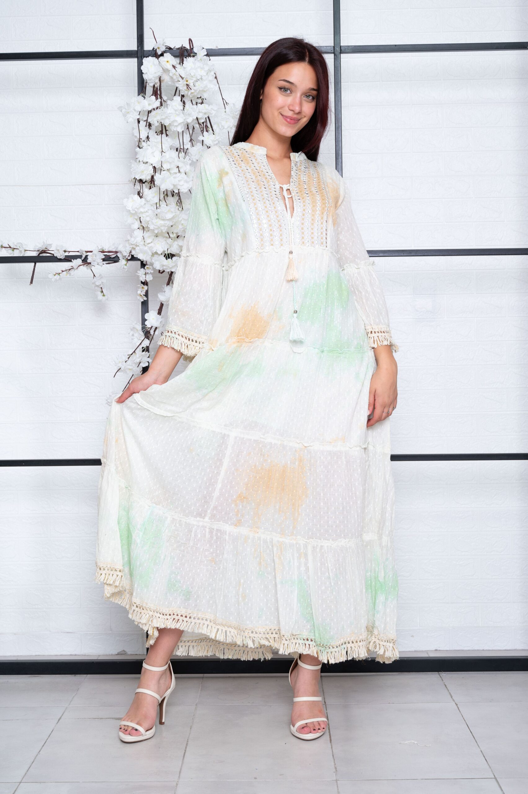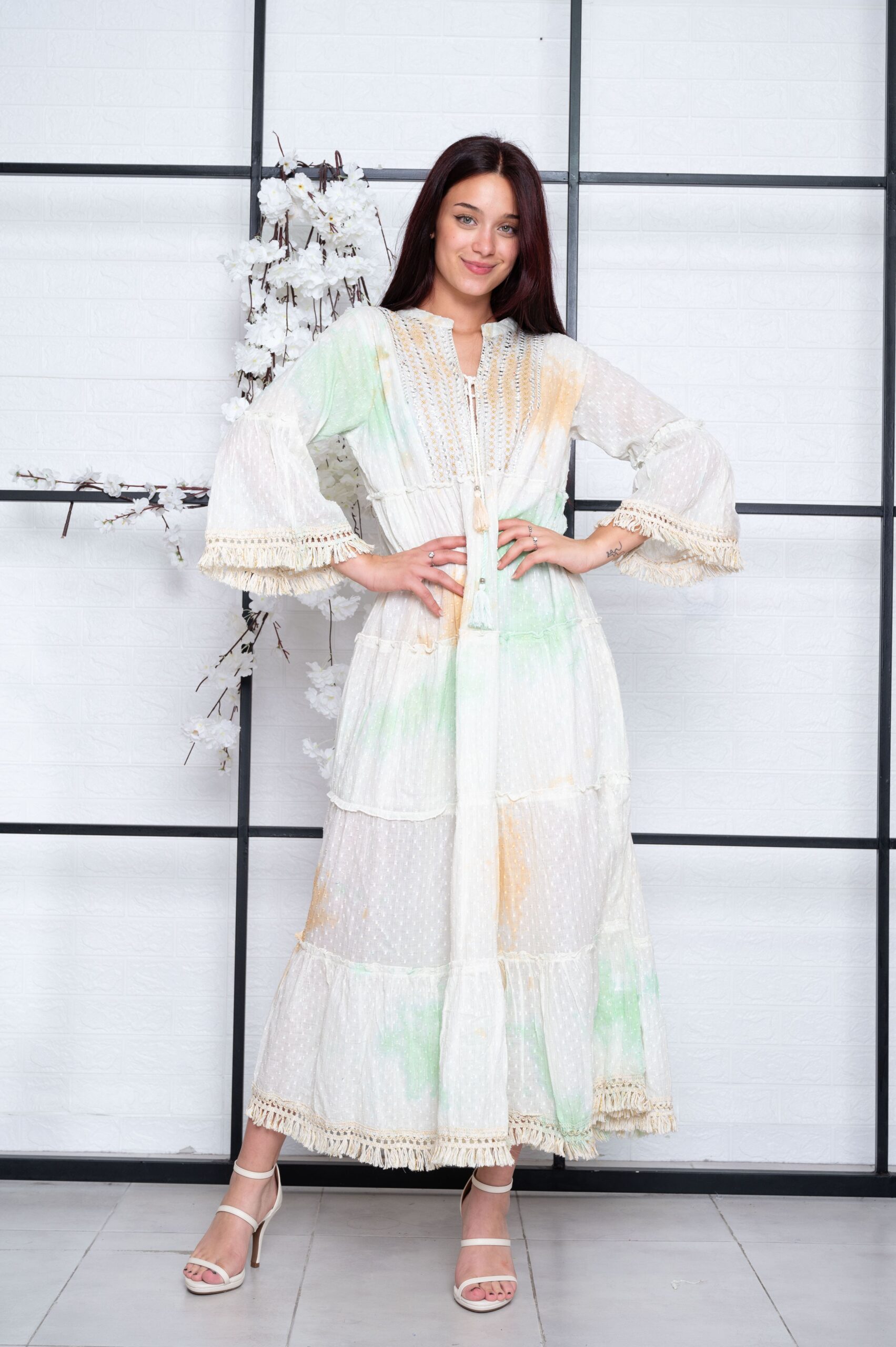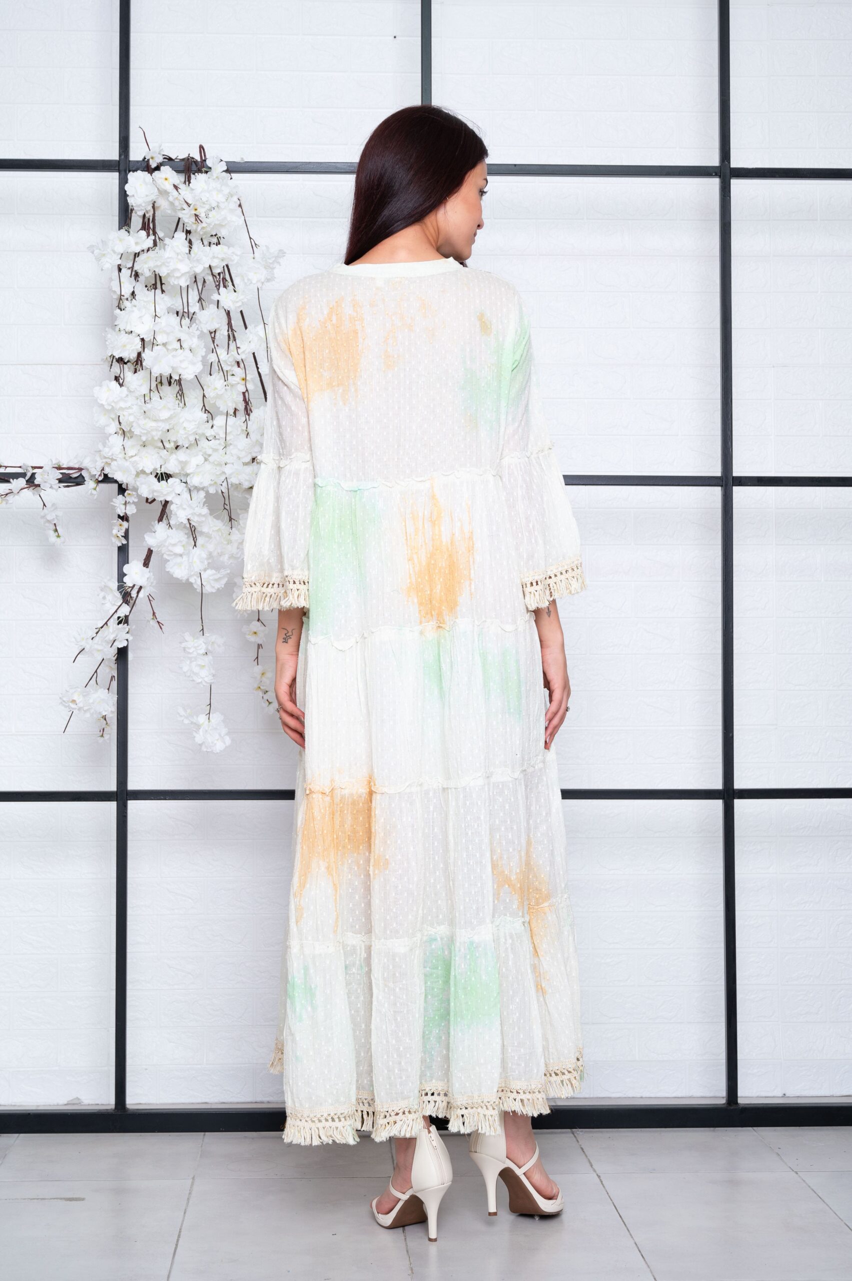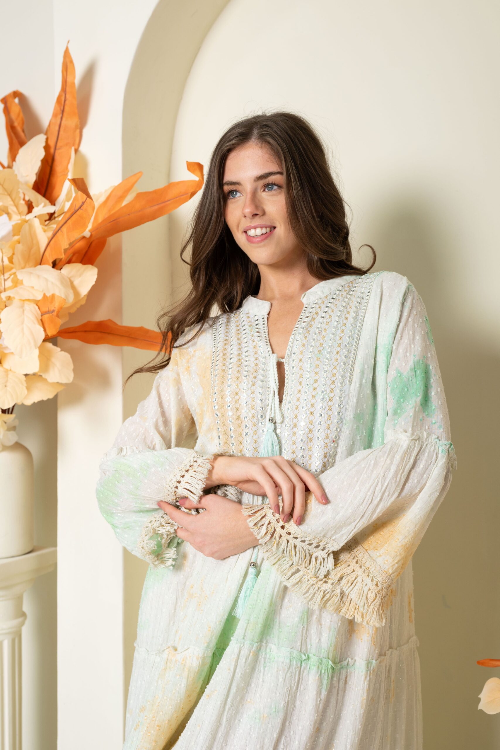 Túnica escote en V con cuello mao. Con Corte imperio y falda en capas. Con bordado artesanal de lentejuelas en escote. Y flecos en puño. Hilado con lurex para crear las lineas verticales y teñido en batik. De algodón hecho en la India.