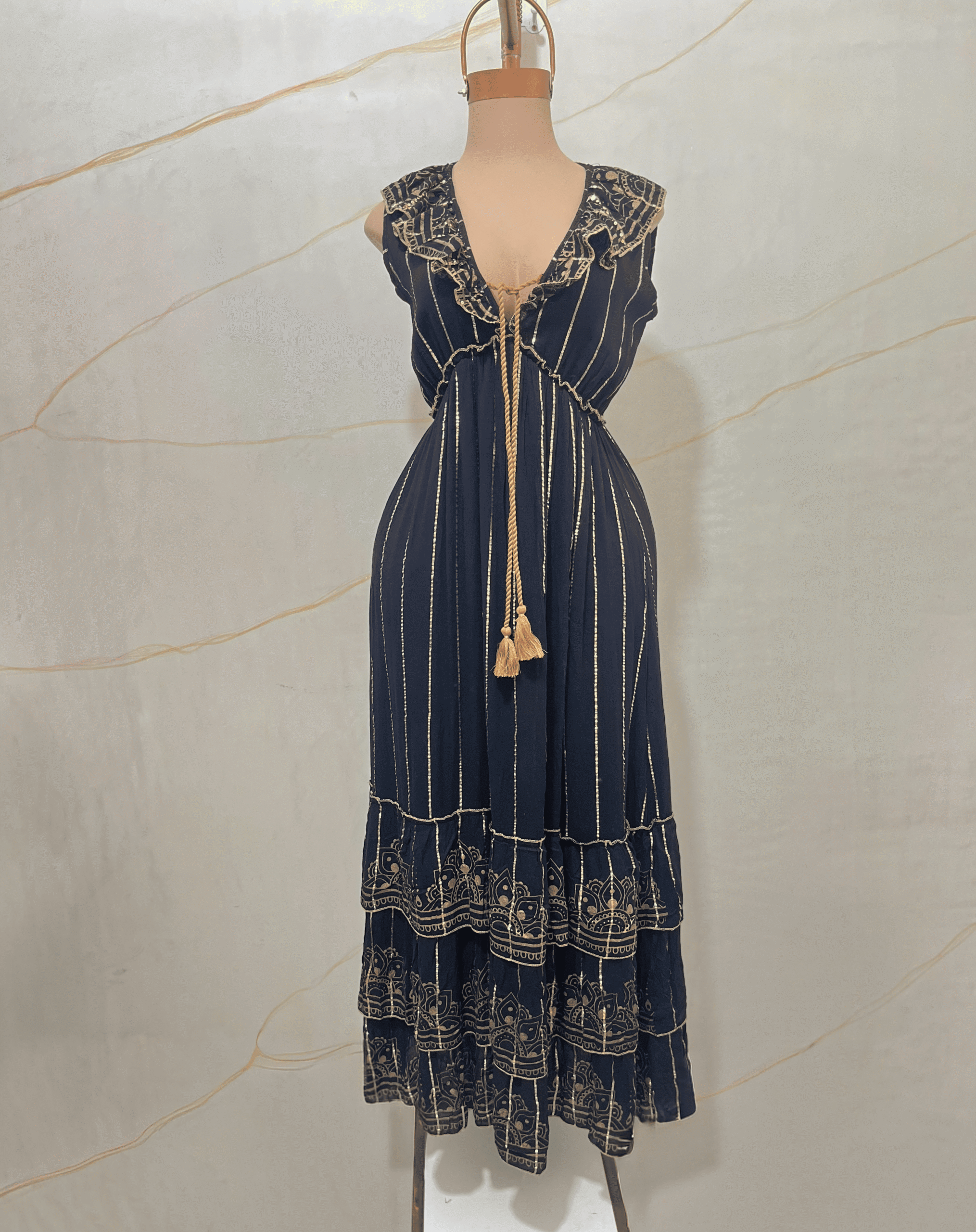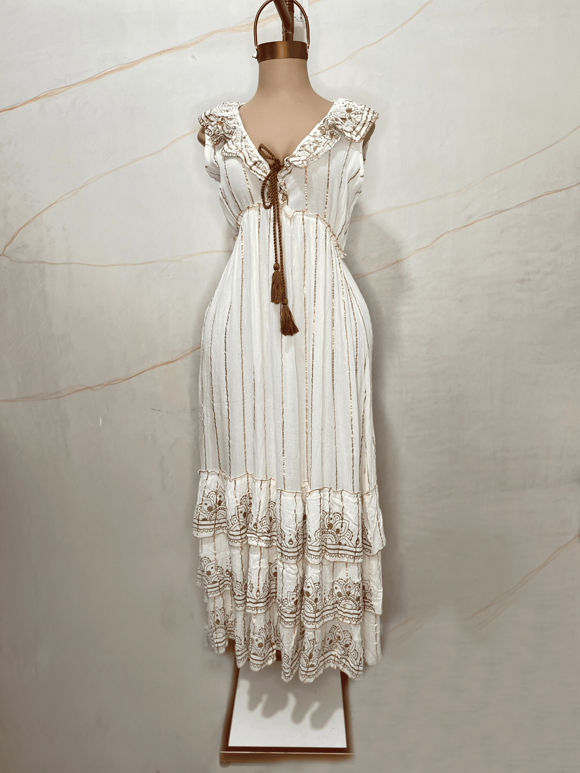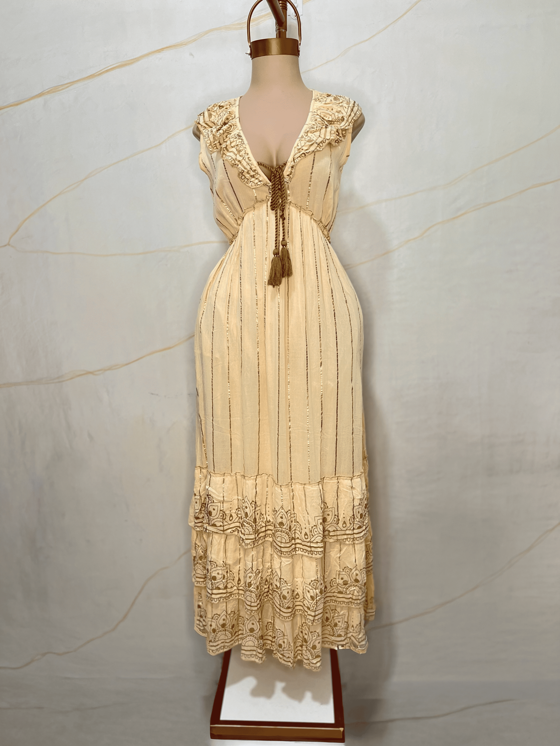 Vestido largo confeccionado en tejido liviano de algodón con textura tipo bambula y delicadas líneas en hilo lurex dorado. Presenta escote en V con terminaciones bordadas y apliques florales en relieve. Posee cordón trenzado con borlas decorativas para ajustar en el escote. Corte imperio que realza la silueta y falda amplia con volados superpuestos y bordados calados en el ruedo. Sin mangas, de calce suelto y fluido. Prenda sin forro interno, importada de la India