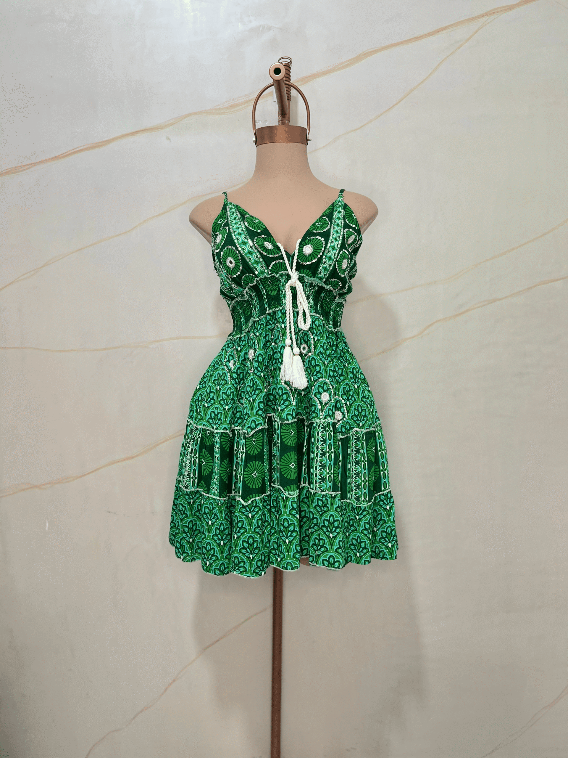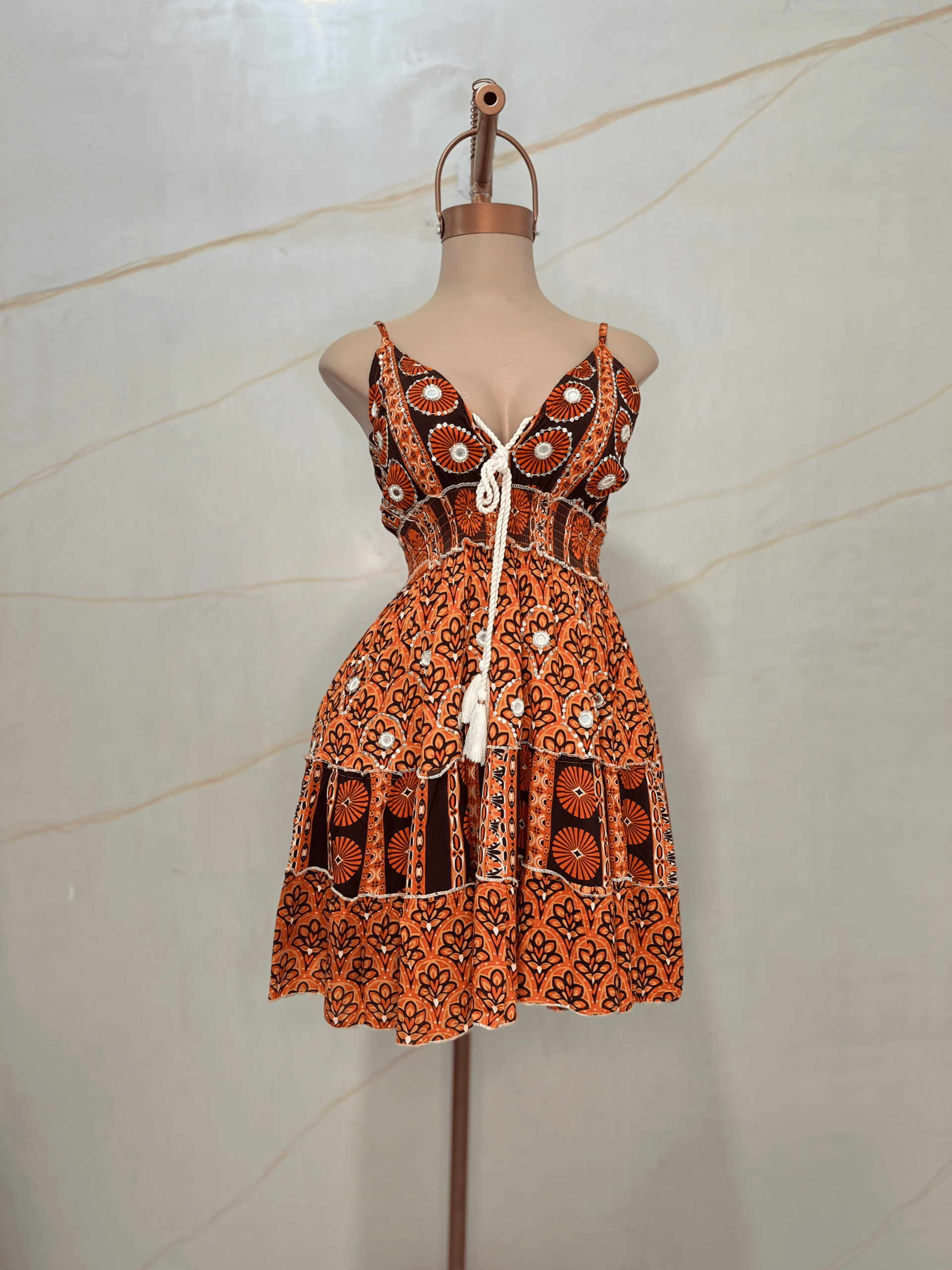 Vestido corto con breteles finos regulables, confeccionado en tejido liviano de algodón estampado importado. Presenta una estampa con motivos hindúes florales y geométricos en tonos naranja, terracota y blanco. Escote en V con cordón trenzado para ajustar en el centro del busto y corte imperio con frunces elásticos en la espalda que aportan mejor calce. La falda está compuesta por paños combinados y terminación en volado. Detalles de bordados decorativos en hilo contrastante y aplicación de pasamanería. Largo por encima de la rodilla.