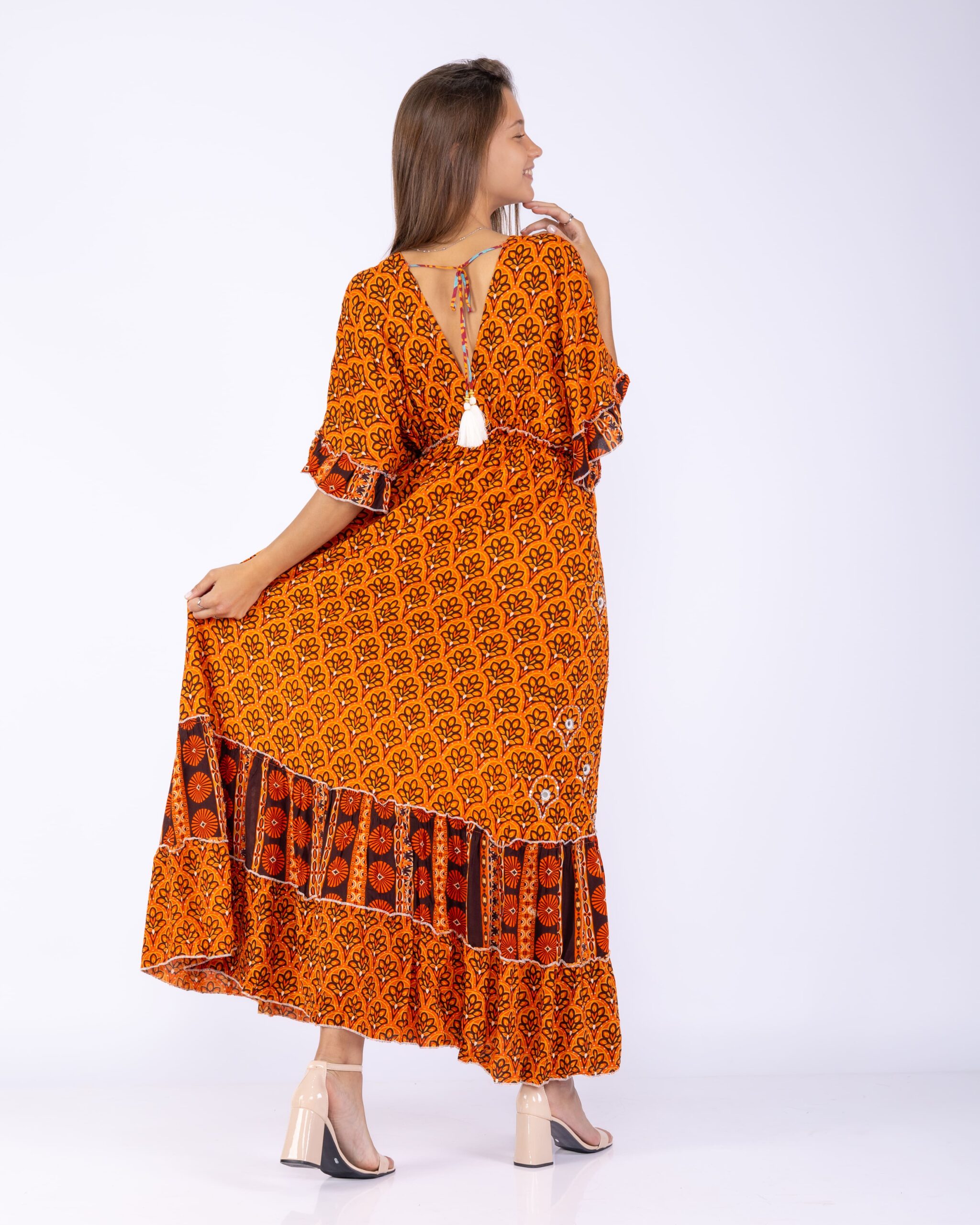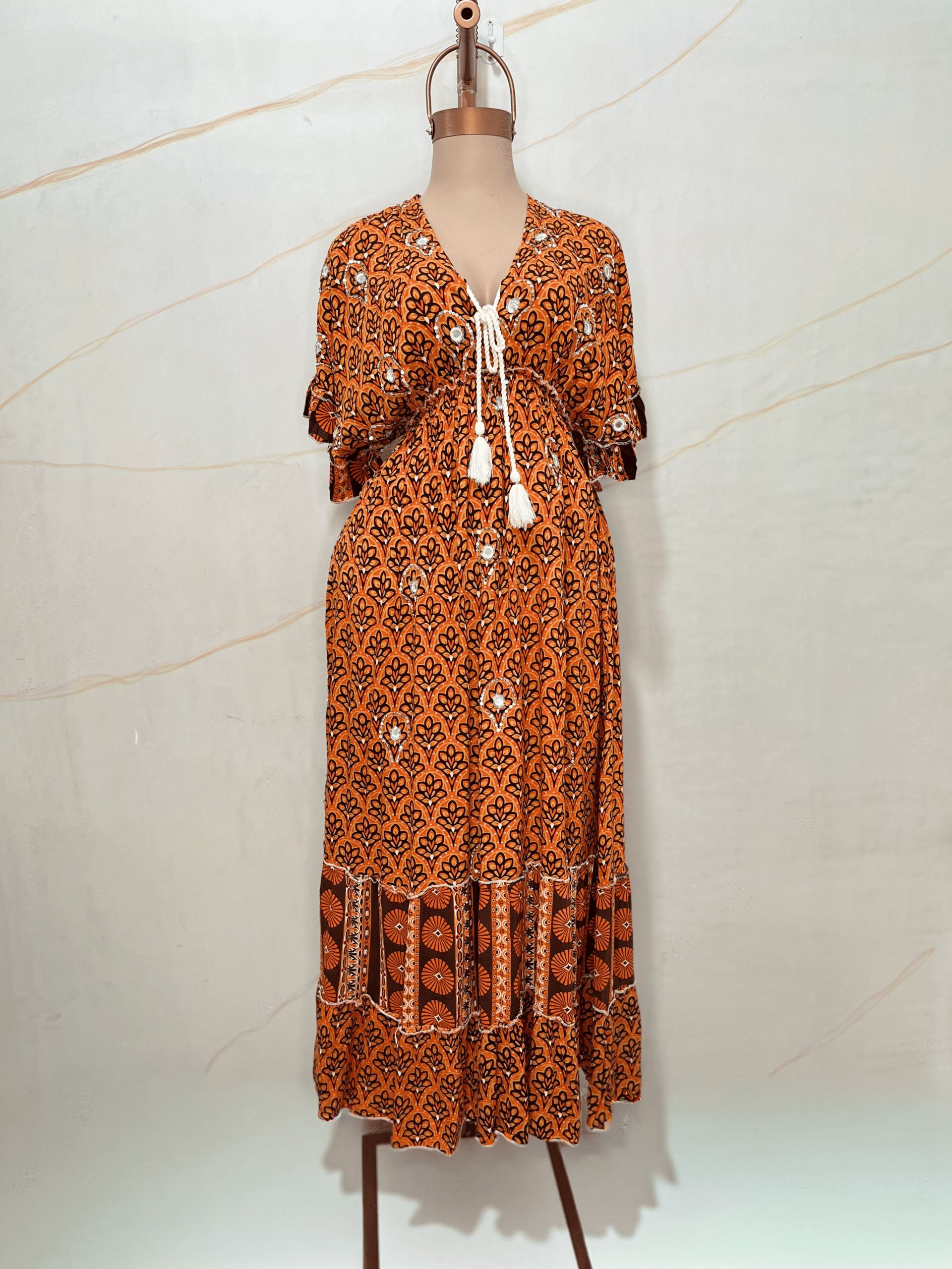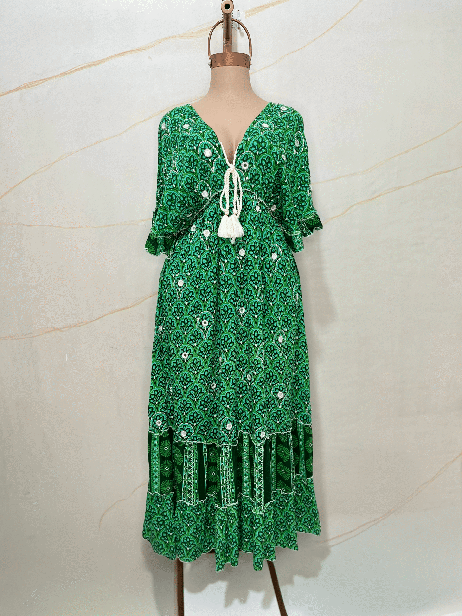 Vestido de algodón ,mangas japonesas con lentejuelas bordas en toda su falda y busto