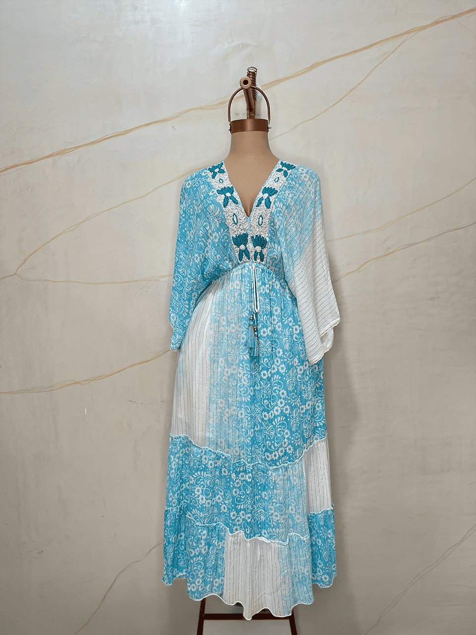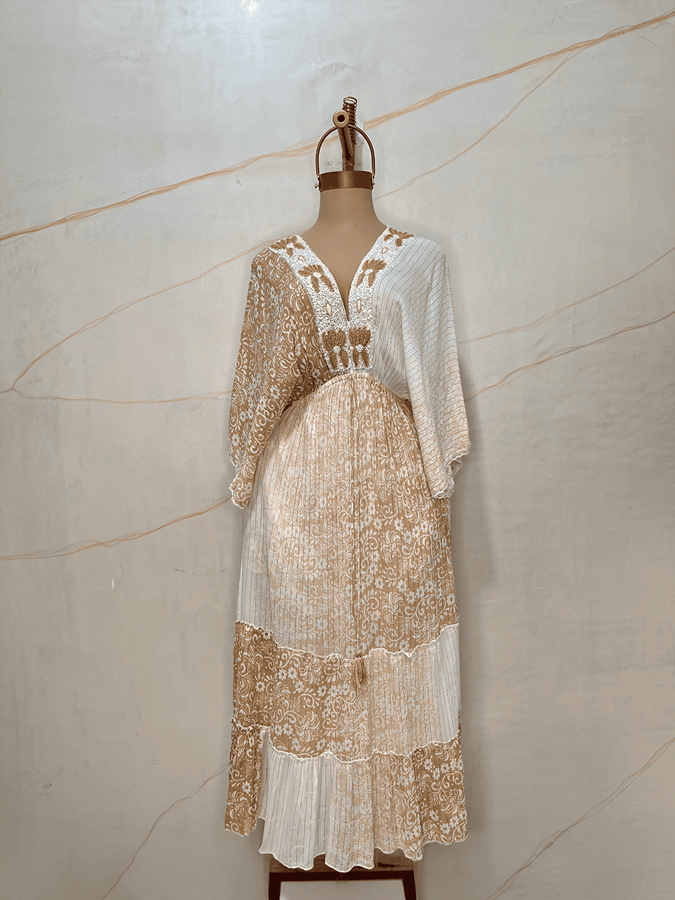 Las mangas amplias tipo murciélago aportan comodidad y un efecto etéreo, mientras que la falda larga con recortes horizontales fruncidos genera volumen y una silueta suelta.