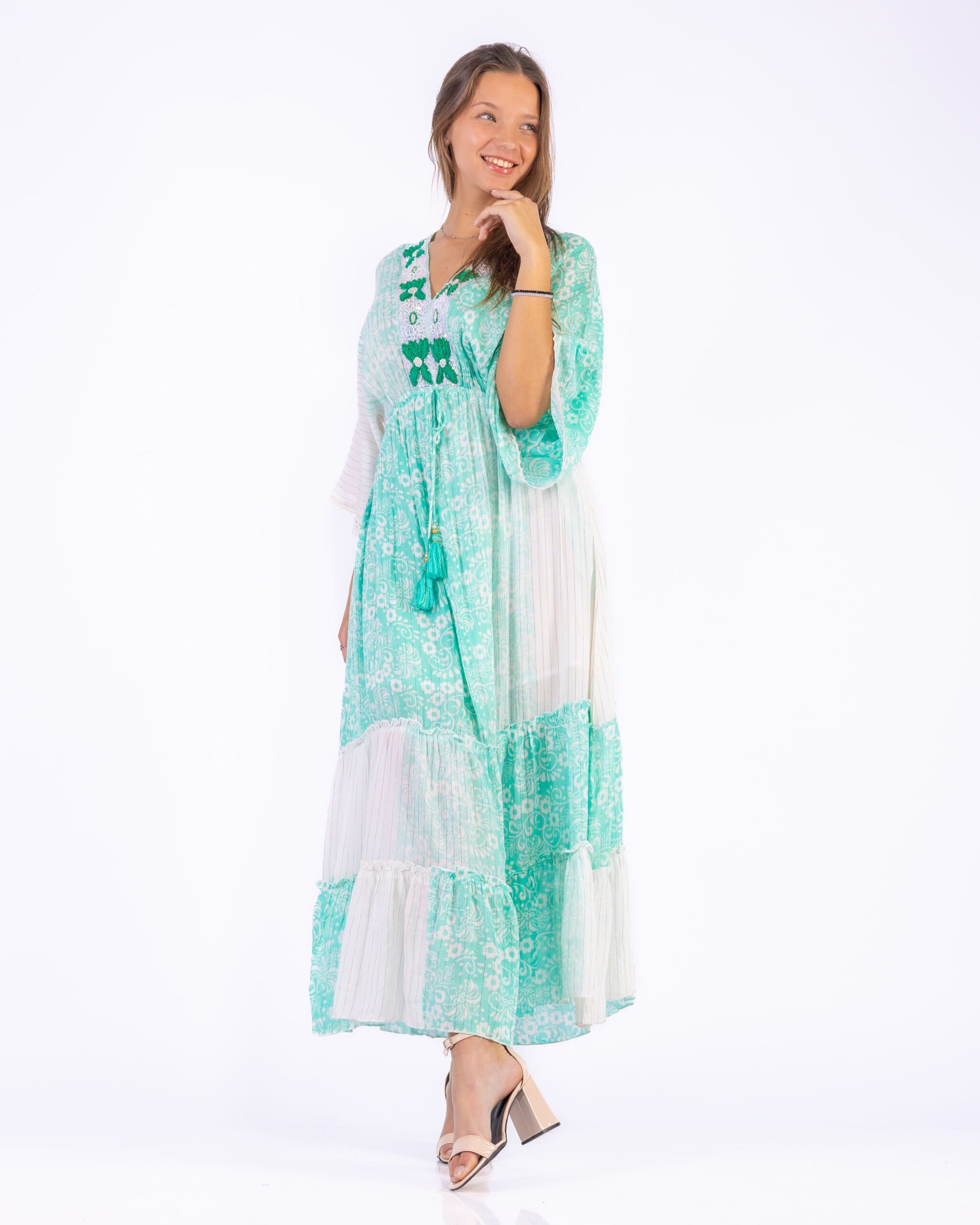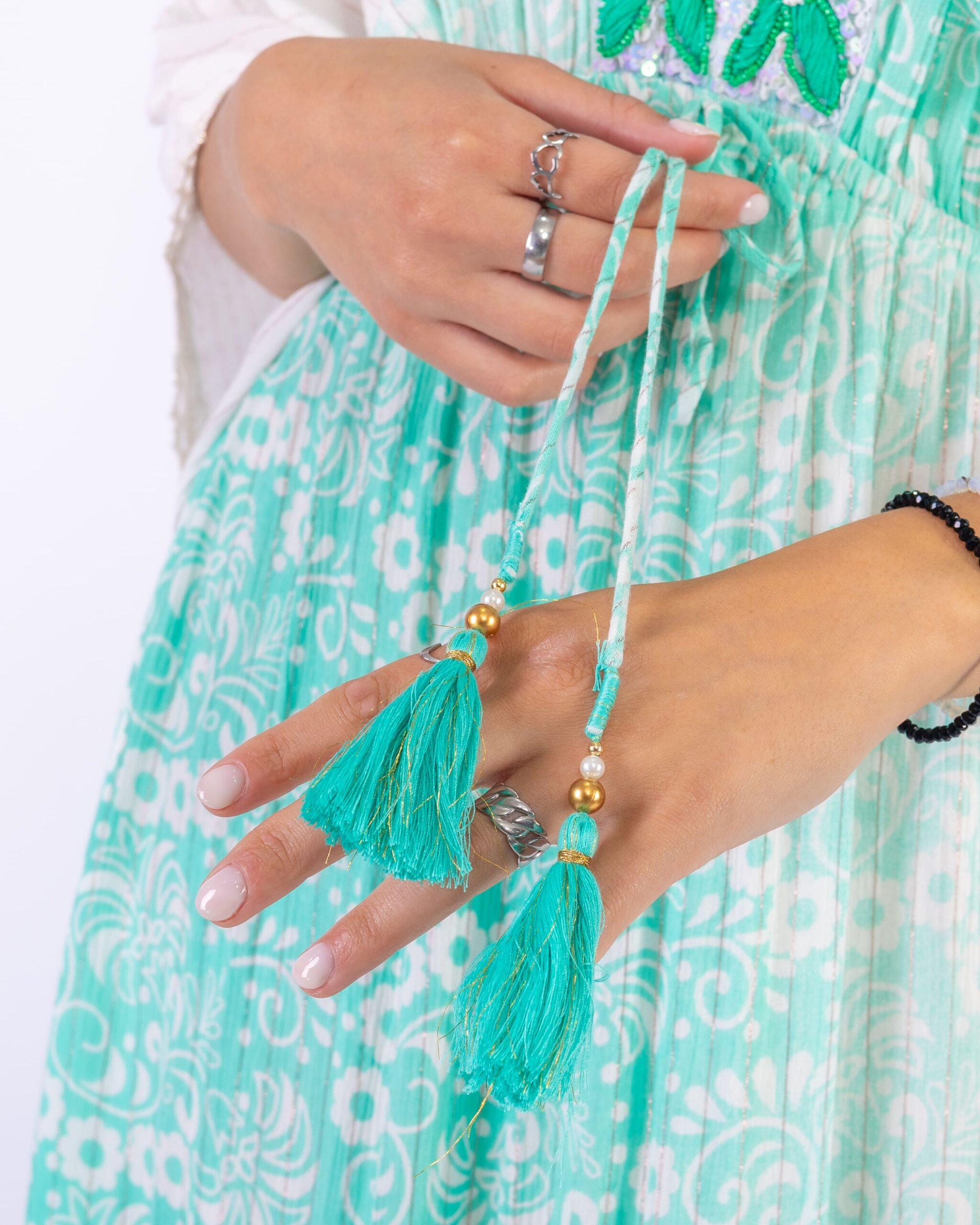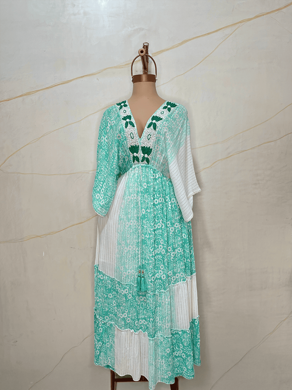 Presenta un escote en V pronunciado con bordado artesanal en hilo verde y blanco, acompañado de aplicaciones de mostacillas que realzan el diseño. En el centro, cuenta con un cordón ajustable terminado en borlas que permite definir la cintura.