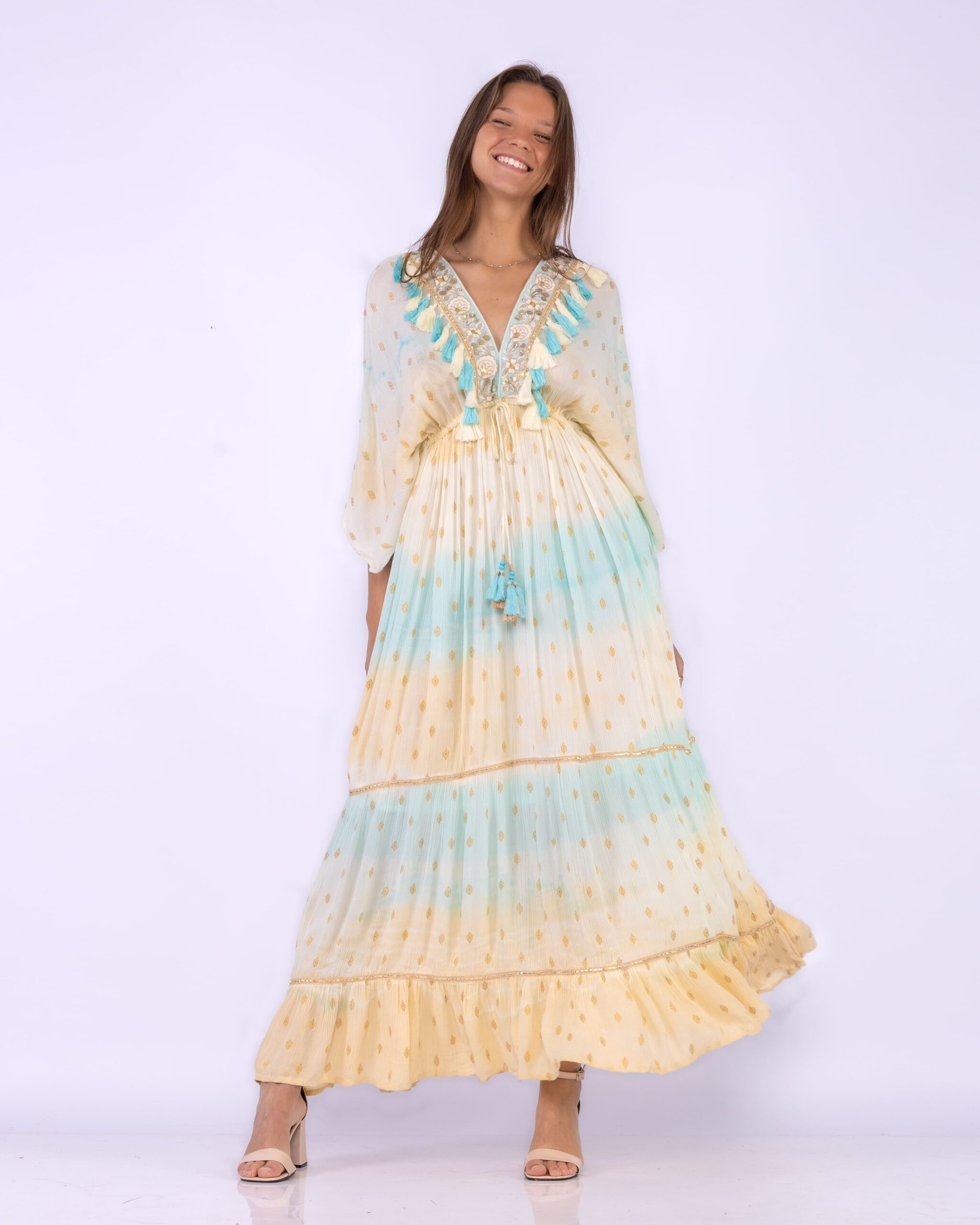 Vestido de lino con detalles en lurex y batik .Mangas japonesas ,en su pecho aplique bordado y detalle de flecos