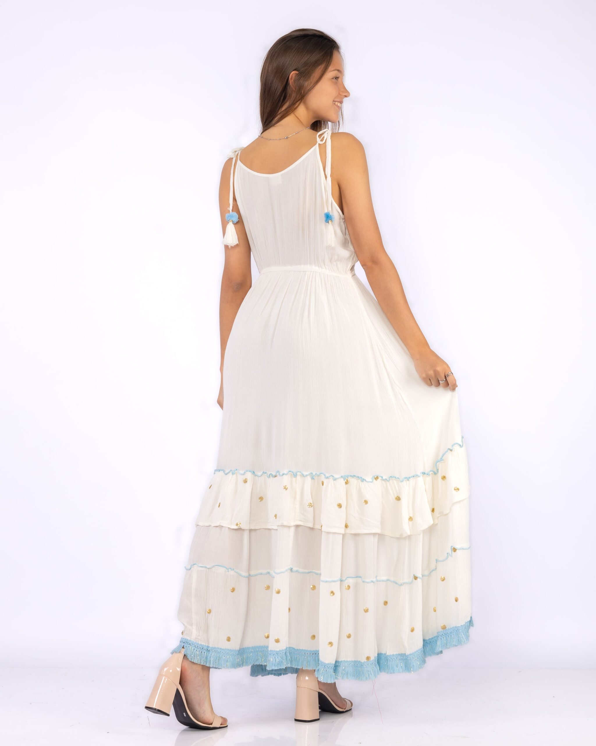 Vestido de Bambula.breteles que se anudan con terminación de pompón.En su busto se encuentra un aplique de lentejuelas con diseño de caracoles .