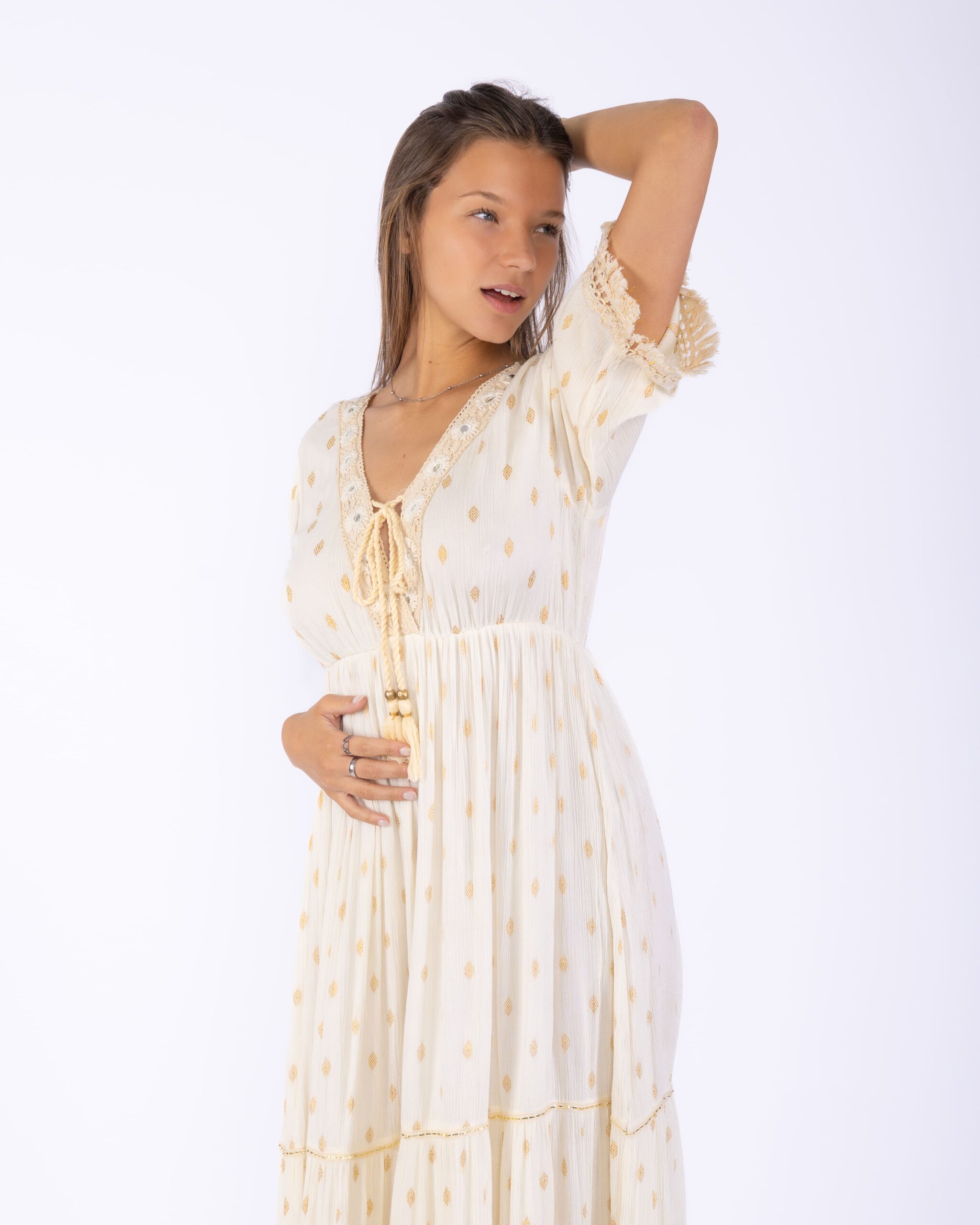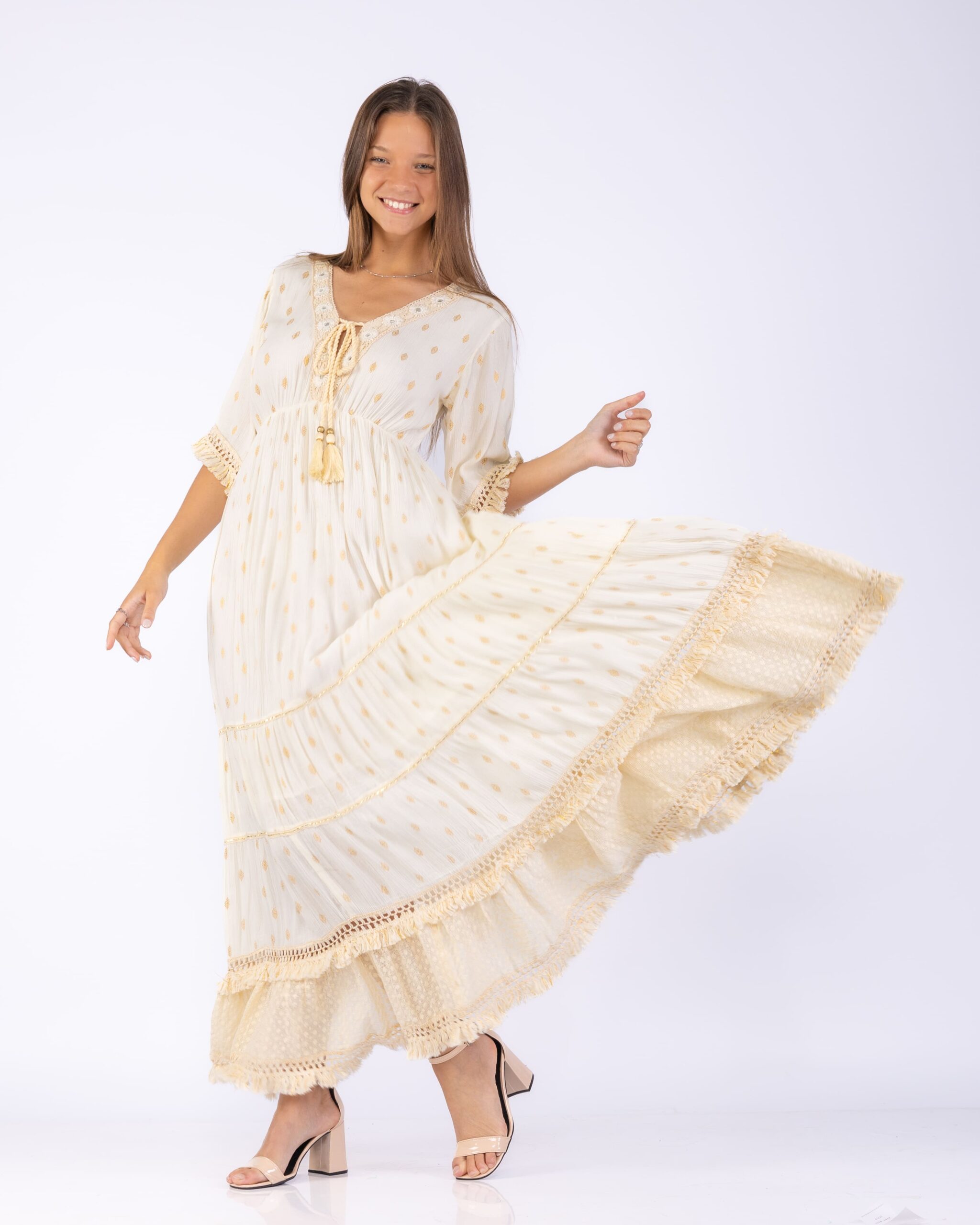 Vestido de tusor de algodón ,con detalles en hilo lurex. Mangas 3/4 con terminación de fleco ,en su busto encontramos una puntilla de algodón con flores bordadas del mismo material .